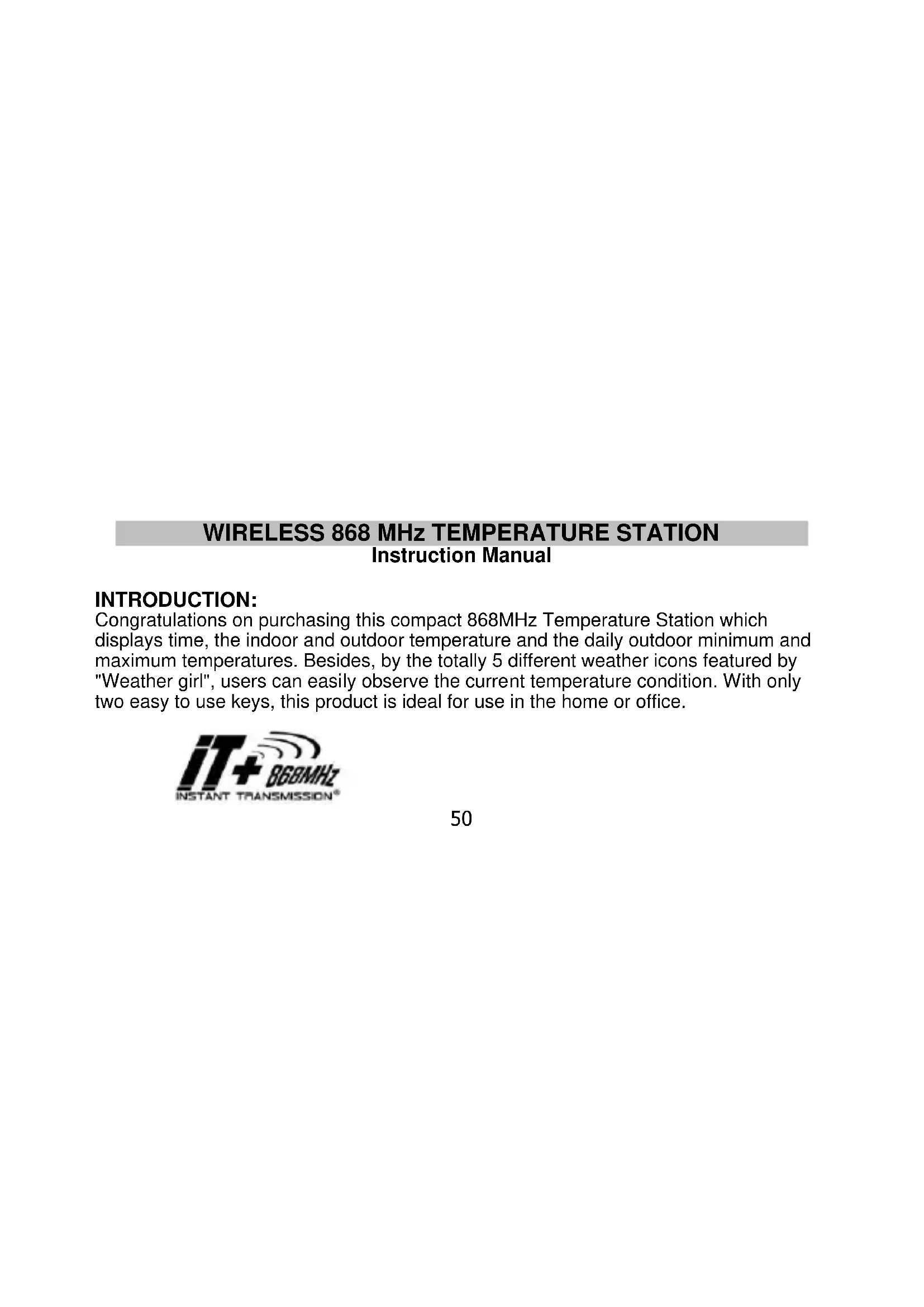 Instruction Manual INTRODUCTION: Congratulations on purchasing this compact 868MHz Temperature Station which displays time, the indoor and outdoor temperature and the daily outdoor minimum and maximum temperatures. Besides, by the totally 5 different weather icons featured by "Weather girl", users can easily observe the current temperature condition. With only two easy to use keys, this product is ideal for use in the home or office.51 FEATURES: