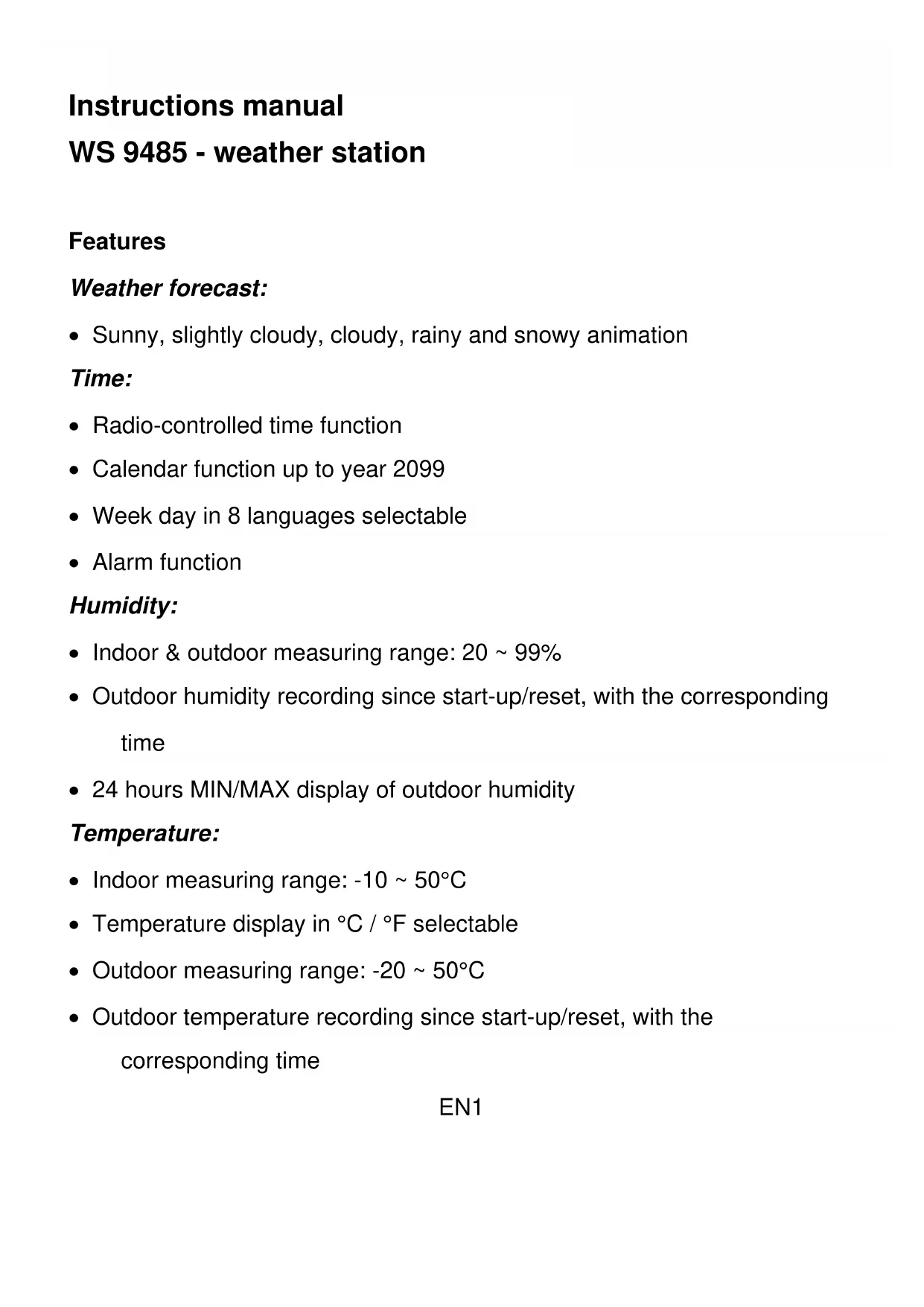 Download the instructions for your Weather Station in PDF format for free! Find your manual WS 9485 - TECHNOLINE and take your electronic device back in hand. On this page are published all the documents necessary for the use of your device. WS 9485 by TECHNOLINE.