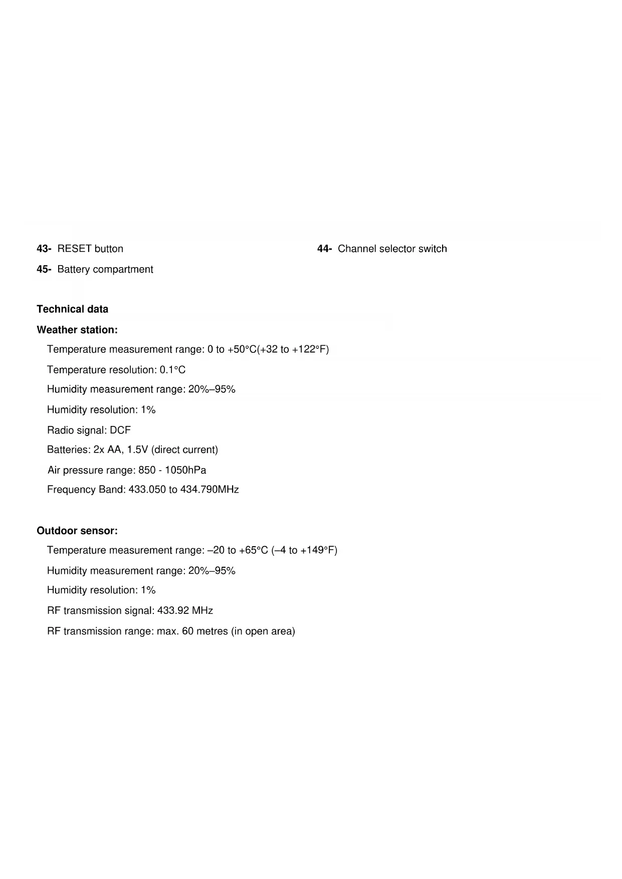 Technical data Weather station: Temperature measurement range: 0 to +50°C(+32 to +122°F) Temperature resolution: 0.1°C Humidity measurement range: 20%–95% Humidity resolution: 1% Radio signal: DCF Batteries: 2x AA, 1.5V (direct current) Air pressure range: 850 - 1050hPa Frequency Band: 433.050 to 434.790MHz Outdoor sensor: Temperature measurement range: –20 to +65°C (–4 to +149°F) Humidity measurement range: 20%–95% Humidity resolution: 1% RF transmission signal: 433.92 MHz RF transmission range: max. 60 metres (in open area)Batteries: 2 x AA, 1.5 V (direct current) Before use Setting up the devices Put the batteries into the outdoor sensor first. CAUTION!: When choosing where to position the weather station, make sure that it is not exposed to direct sunlight, vibrations, dust, heat, cold or moisture. Do not place the devices close to sources of heat, e.g. radiators. Otherwise they may be damaged. Do not place the devices on valuable or sensitive surfaces unless these are appropriately protected. Otherwise they may be damaged. Please ensure that neighboring devices are not operated at the same frequency of 433 MHz. Such devices may cause interference to the radio connection. Do not place the devices next to or on metal plates. Otherwise the quality of radio wave transmission may be reduced. Do not install the devices in buildings made of reinforced concrete, e.g. airports, high-rise buildings, factories or cellars. Otherwise the transmission of the radio waves between the devices may be severely impaired. Preparing to use the outdoor sensor Remove the battery compartment cover from the back of the outdoor sensor. Insert 2 x AA batteries accordingly to right polarity (+/-). The outdoor sensor is now ready for operation and the control LED (41) lights up briefly. Close the battery compartment cover. Installing the Outdoor Sensor: Find an appropriate place for the outdoor sensor, protected from rain and direct sun light. Note: Please ensure that you install the outdoor sensor within a radius of maximum 60m (open area) from the weather station. Check that there are no obstacles between the outdoor sensor and the weather station. Otherwise there may be interference of the transmission of data. For wall mounting: Hang the outdoor sensor with the mount (42) on one screw. Preparing the weather station for use Open the battery compartment (40) on the back of the weather station. Insert 2 x AA batteries accordingly to right polarity (+/-). Then close the battery compartment. As soon as the battery safety strip has been removed, the weather station starts to receive the radio signal. Note: Do not move the weather station while it is receiving the signal. This may disrupt reception.Connecting the weather station with the outdoor sensor and the DCF radio signal: After installing of batteries, the weather station attempts to establish a connection with the outdoor sensor. This process can take a few minutes. The symbol will keep flashing for few minutes. On successful connection with the outdoor sensor, the selected channel symbol (27) appears in the LC display with the channel of the outdoor sensor (if necessary you can change the channel of the outdoor sensor as shown in the section “Setting the channel”). If the connection with the outdoor sensor is not established automatically, this can be done manually as follows: Press the channel button (CH) (37) short until the desired channel (27) is displayed, then press and hold the CH button until the radio waves icon flashes. T Then press the RESET button (43) of the sensor. Weather station outdoor temperature (25) and humidity(outdoor) (22) will be displayed. As soon as the weather station has established a connection with the outdoor sensor it automatically begins to receive the DCF radio signal. This process takes several minutes and is indicated by a flashing radio tower symbol (5). When the DCF radio signal is being successfully received, the radio tower symbol is shown permanently in the display. If at the time of putting the device into operation it is not possible to synchronize with the atomic clock, you can also do the clock adjustments manually (“Setting the 12/24 hour mode /°C /°F/ hPa/ inHg/time zone /time/date/language manually”).Radio signal (DCF): The DCF signal (time signal transmitter) consists of time pulses emitted by one of the most accurate clocks in the world close to Frankfurt /Main, Germany. In ideal conditions, your weather station can pick up this signal over a distance of up to approx. 2000 km around Frankfurt / Main. Reception of the radio signal generally takes approx. 3–10 minutes. Reception can be considerably impaired by obstacles (e.g. concrete walls) or sources of interference (e.g. other electrical devices). In the event of reception problems, change the position of the weather station (e.g. to somewhere near a window). Operation Receiving the DCF radio time signal After a connection with the outdoor sensor is established or 3 minutes after the batteries are installed, the weather station automatically begins to search for the DCF radio signal. The search is shown in the LC display by the radio tower symbol (5) flashing. Note: In buildings made of reinforced concrete the reception of the radio signal may be severely impaired (see “Setting up the devices”). In order to correct any deviations from the exact time, the clock is automatically synchronized with the DCF radio signal every day at 1:00, 2:00 and 3:00. Reception of the DCF radio signal can also be started manually on the weather station. Press the + and – button (35), (36) at the same time. The weather station attempts to receive the DCF radio signal.This process takes several minutes and is indicated by a flashing radio tower symbol. If the connection with the DCF radio signal cannot be established, the search is stopped. Note: If the clock of the weather station cannot receive the DCF radio signal due to errors, too great a dist