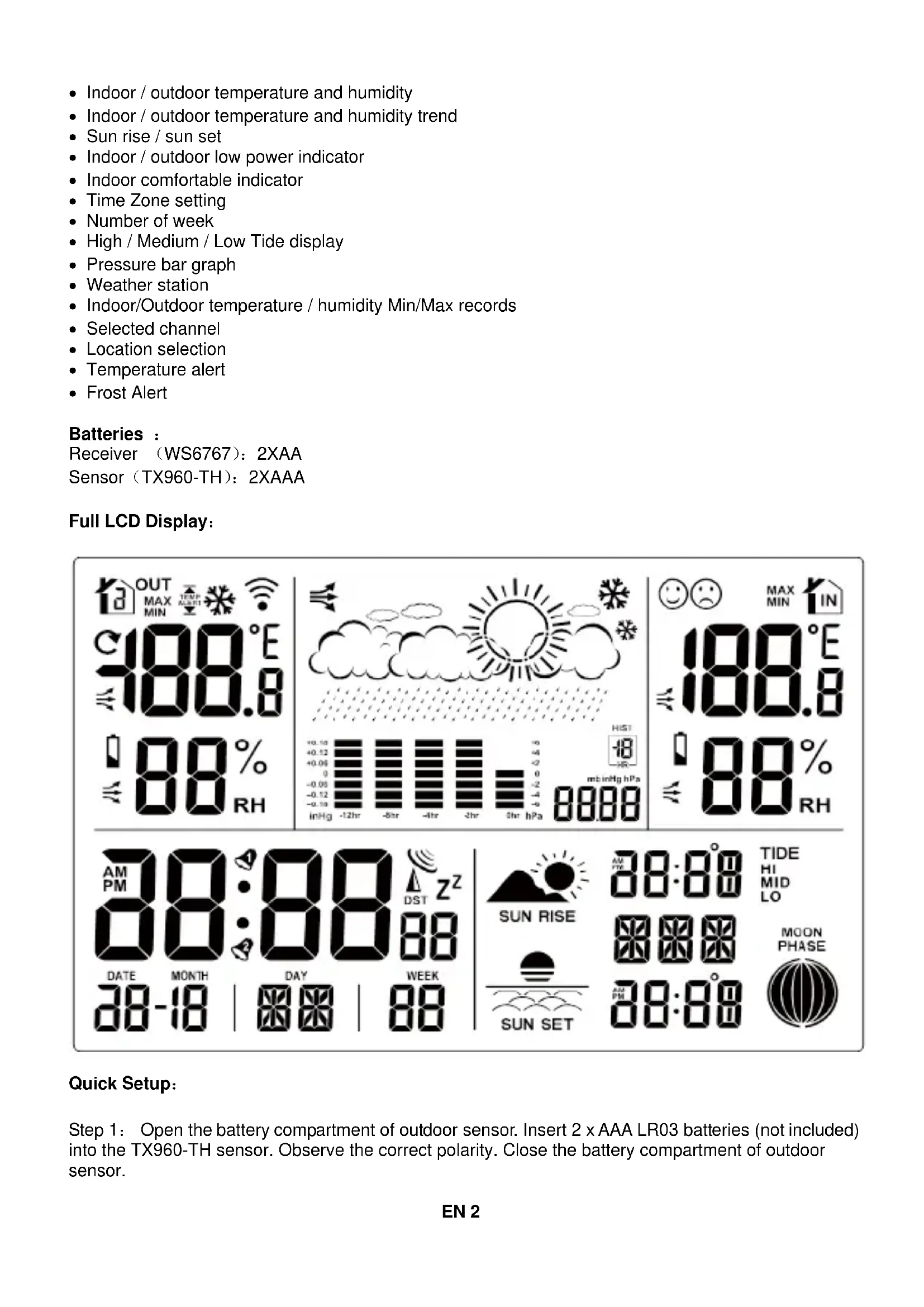 Quick Setup: Step 1: Open the battery compartment of outdoor sensor. Insert 2 x AAA LR03 batteries (not included) into the TX960-TH sensor. Observe the correct polarity. Close the battery compartment of outdoor sensor.EN 3 Step 2:Open the battery compartment of weather station. Insert 2 x AAA LR06 batteries (not included) into the weather station.Observe the correct polarity. The red LED will flash during transmission. Close the battery compartment of weather station. Restart: If there is no outdoor temperature and humidity data after 3 minutes, remove the batteries from station and out sensor for 15 minutes then return to step 1above. Power On: