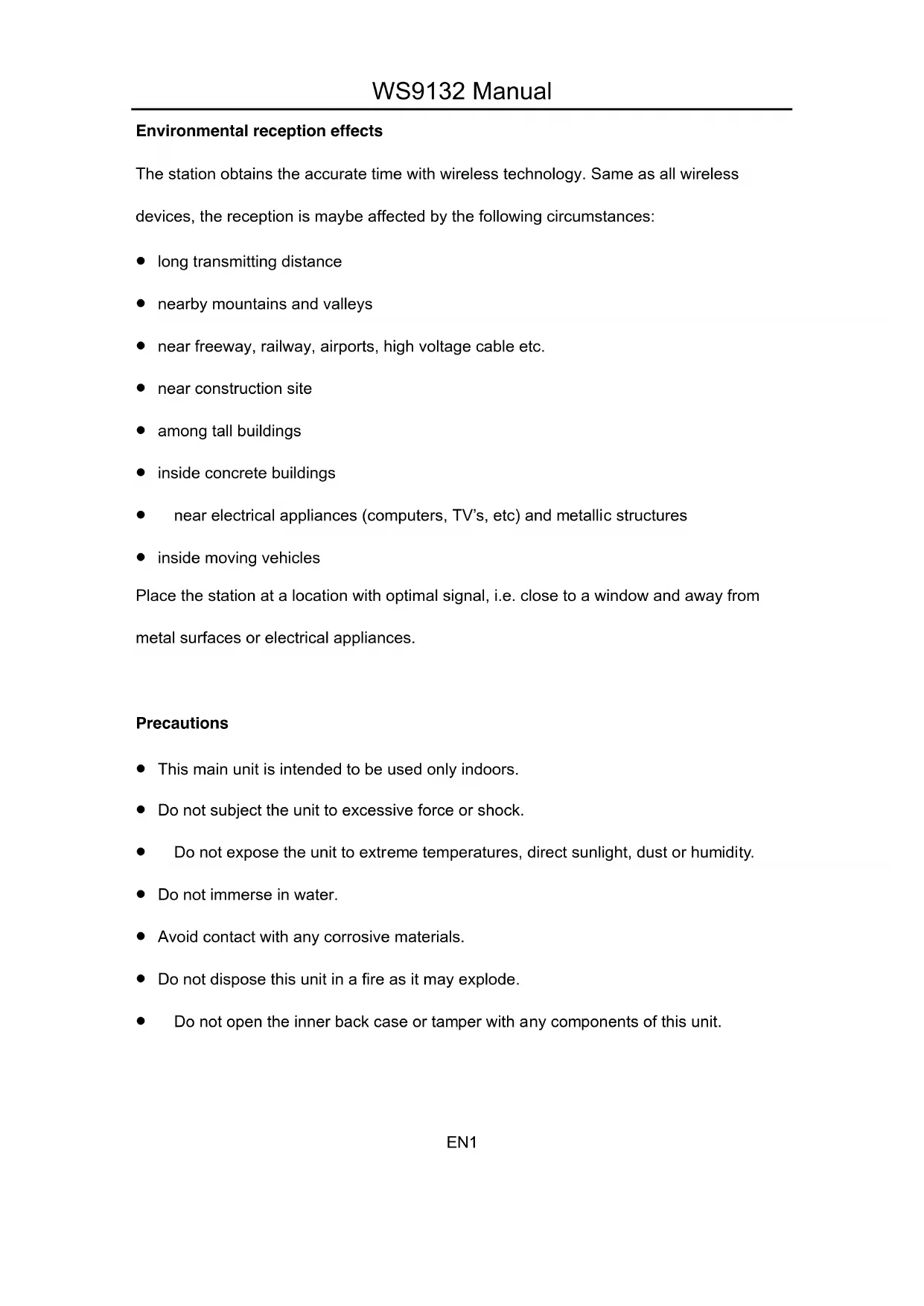 Sonnig Leicht bewölkt Bewölkt Regen SchneeDE14 Luftfeuchtigkeitsgenauigkeit: 40-80%: ±5% 20~39%,81-95%: ±8% Funkempfangsreichweite: 30 Meter (Freifeld) Luftdruckmessbereich: 850-1100hpa Luftdruckgenauigkeit: ±5hpaEN1 WS9132 Manual Environmental reception effects The station obtains the accurate time with wireless technology. Same as all wireless devices, the reception is maybe affected by the following circumstances: x long transmitting distance x nearby mountains and valleys x near freeway, railway, airports, high voltage cable etc. x near construction site x among tall buildings x inside concrete buildings x near electrical appliances (computers, TV’s, etc) and metallic structures x inside moving vehicles Place the station at a location with optimal signal, i.e. close to a window and away from metal surfaces or electrical appliances. Precautions x This main unit is intended to be used only indoors. x Do not subject the unit to excessive force or shock. x Do not expose the unit to extreme temperatures, direct sunlight, dust or humidity. x Do not immerse in water. x Avoid contact with any corrosive materials. x Do not dispose this unit in a fire as it may explode. x Do not open the inner back case or tamper with any components of this unit.EN2 Batteries safety warnings x Use only alkaline batteries, not rechargeable batteries. x Install batteries correctly by matching the polarities (+/-). x Always replace a complete set of batteries. x Never mix used and new batteries. x Remove exhausted batteries immediately. x Remove batteries when not in use. x Do not recharge and do not dispose of batteries in fire as the batteries may explode. x Ensure batteries are stored away from metal objects as contact may cause a short circuit. x Avoid exposing batteries to extreme temperature or humidity or direct sunlight. x Keep all batteries out of reach from children. They are a choking hazard. Use the product only for its intended purpose! Consideration of duty according to the battery law Old batteries do not belong to domestic waste because they could cause damages of health and environment. You can return used batteries free of charge to your dealer and collection points. As end-user you are committed by law to bring back needed batteries to distributors and other collecting points! Consideration of duty according to the law of electrical devices This symbol means that you must dispose of electrical devices separated from the General household waste when it reaches the end of its useful life. Take your unit to your local waste collection point or recycling centre. This applies to all countries of the European Union, and to other European countries with a separate waste collection system.EN3 Hereby, Technotrade declares that this product WS 9132 is in compliance with the essential requirements and other relevant provisions of Directive 2014/53/EU and ROHS 2011/65/EC. The original EU declaration of conformity may be found at: www.technoline.de/doc/4029665091327 Features: ` DCF Radio controlled time function ` 12/24 hour format ` Daily Alarm Function ` Snooze function (OFF or 1~60min) ` Low battery indicator ` Maximum /minimum value record of temperature and humidity ` Temperature in °C or °F ` Outdoor thermometer ice alert ` Humidity measurable range: 20%RH ~ 95%RH ` Temperature: — Indoor temperature measurement ranges: -9.9°C (14.2°F) ~ 50°C (122°F) — Outdoor temperature measurement ranges: -25°C (-13°F) ~ 50°C (122°F) ` Remote Sensor: — Wall Mount or Table Stand — 3 Channels selectable — 433.92MHz RF transmitting frequency — 30 meter transmission range in an open area ` Weather forecasting functionEN4 ` Power Supply: Weather Station: Battery: 2 x LR03 AAA Remote Sensor: Battery: 2 x LR06 AA Weather Station AppearanceEN5