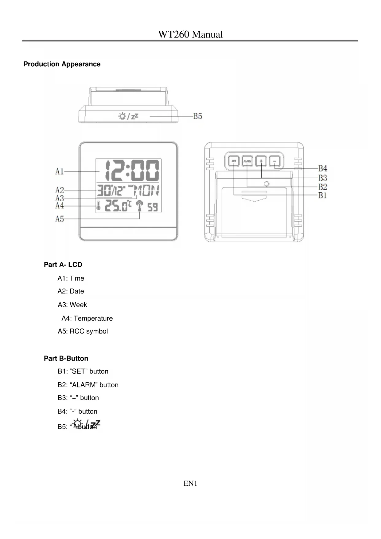 Part A- LCD A1: Time A2: Date A3: Week A4: Temperature A5: RCC symbol Part B-Button B1: “SET” button B2: “ALARM” button B3: “+” button B4: “-” button B5: “ ” buttonEN2 Features: Radio controlled DCF-77 clock 12/24 hour time format Manual time setting Continuous calendar up to year 2099 Date and weekday display Temperature alternatively in °C or °F Automatic snooze function (5 minutes) Thermometer: Indoor measurement range: -9.9°C ~ 49.9°C Battery: battery 1.5V “AAA” size x 2 pcs (not included) Initial operation: Open the battery compartment cover Insert 2 x AAA batteries observing polarity [ “+” and “ –“ marks] When you insert the batteries, all icons on the LCD display will light up for 3 seconds, you will hear a beep tone and the station detects indoor temperature. Reception of the DCF radio controlled signal: The clock automatically starts the DCF signal search after starting up. The radio mast symbol starts to flash. At 1:00am the Radio Controlled clock automatically carries out a synchronization procedure with the DCF signal to correct any deviations to the exact time. If this synchronization attempt is unsuccessful (The radio mast symbol disappears from the display), the system will automatically attempt another synchronization at the next full hour. This procedure is repeated automatically up to 5 times. To start manual DCF signal reception manually, press and hold the “-“ button, If no signal is received within seven minutes, then the DCF signal search stops (the radio mast symbol disappears) and starts again the next full hour. Please note: If the clock cannot receive the DCF signal (because the distance is too great to receive a signal from the transmitter in Mainflingen,Germany), you have the option of setting the time manually as mentioned below. As soon as the reception of the DCF signal is possible, then the clock is readjusted automatically. We recommend a minimum distance of 2.5 meters(8.2 Feet) to all sources of interference, such as televisions or computer monitors, Radio reception is weaker in rooms with concrete walls and in offices. In such extreme circumstances, place the clock close to the window.EN3 Manual time setting: To start manual DCF signal reception, press and hold the "-" button, If no signal is received within seven minutes, then the DCF signal search stops (the radio mast symbol disappears) and starts again the next full hour. Press and hold the “SET” button for 2 seconds, 12/24HR start to flash. Now use “+” and “-” buttons to switch 12/24 hour mode. Press “SET” to confirm your setting, the time zone starts to flash. Use“+” and “-“ buttons to set a correct time zone. For UK time please set time zone to -1. Press “SET” to confirm your setting, the hour display starts to flash. Now use “+” and “-“buttons to set the hour. Press “SET” to confirm your setting, the minute displays starts to flash. Now use “+” and “-“buttons to set the minute. Press “SET” to confirm your setting, the year display 2009 starts to flash. Now use “+” and “-“ buttons to set the year. Press SET to confirm your setting, the month display starts to flash. Now use “+” and “-“ buttons to set the month. Press “SET” to confirm your setting, the Date display starts to flash. Now use “+” and “-“ buttons to set the date. Press “SET” to confirm your setting, the weekday language display starts to flash. Now use “+” and “-“ buttons to set the weekday language in GER, ENG, ITA, FRE, DUT,SPA or DAN Press “SET” to confirm your setting and to end the setting procedures, enter the clock mode. Please note: If there is no valid operation within 30 seconds, the clock will automatically return to normal time mode from the set mode. Setting the daily alarm: Press and hold down the “ALARM” button for 2 seconds until the alarm time is flashing. The Hour display of the Alarm time starts to flash. Use the “+” and “-“buttons to set the hour. Press “ALARM” button to confirm your setting The Minute display of the Alarm time starts to flash. Use the “+” and “-“buttons to set the minute. Press “ALARM” button to confirm your setting and to end the setting procedure. To activate or deactivate the daily alarms, press the “ALARM” button once. When active, a bell icon isEN4 displayed. Please note: If there is no valid operation within 30 seconds, the clock will automatically return to normal time mode from the set mode. The alarm will sound for 2 minutes if you do not deactivate it by pressing any button. In this case the alarm will be repeated automatically after 24 hours. Rising alarm sound (crescendo, duration: 2 minutes) Automatic Snooze function: While the alarm is sounding, touch the “ ” to activate snooze function. The Snooze function is active and a flashing “ ” icon appears on the display. This stops the alarm for 5 minutes and will sound again. The Snooze function can be interrupted by pressing any other button. °C/°F temperature display: The temperature is displayed either in °C or °F. Pressing the “- “ button allows you to switch between °C or °F. Hereby, Technotrade declares that this product WT260 is in compliance with the essential requirements and other relevant provisions of Directive 2014/53/EU and ROHS 2011/65/EC. The original EU declaration of conformity may be found at: www.technoline.de/doc/4029665002606 Specifications: Battery life 12 months Environmental requirement: usage -10~50℃ & 20%~95% storage -20~60℃ & 20%~95% Environmental reception effects The clock obtains the accurate time with wireless technology. Same as all wireless devices, the reception is maybe affected by the following circumstances: long transmitting distance nearby mountains and valleys near freeway, railway, airports, high voltage cable etc. near construction siteEN5 among tall buildings inside concrete buildings near electrical applian