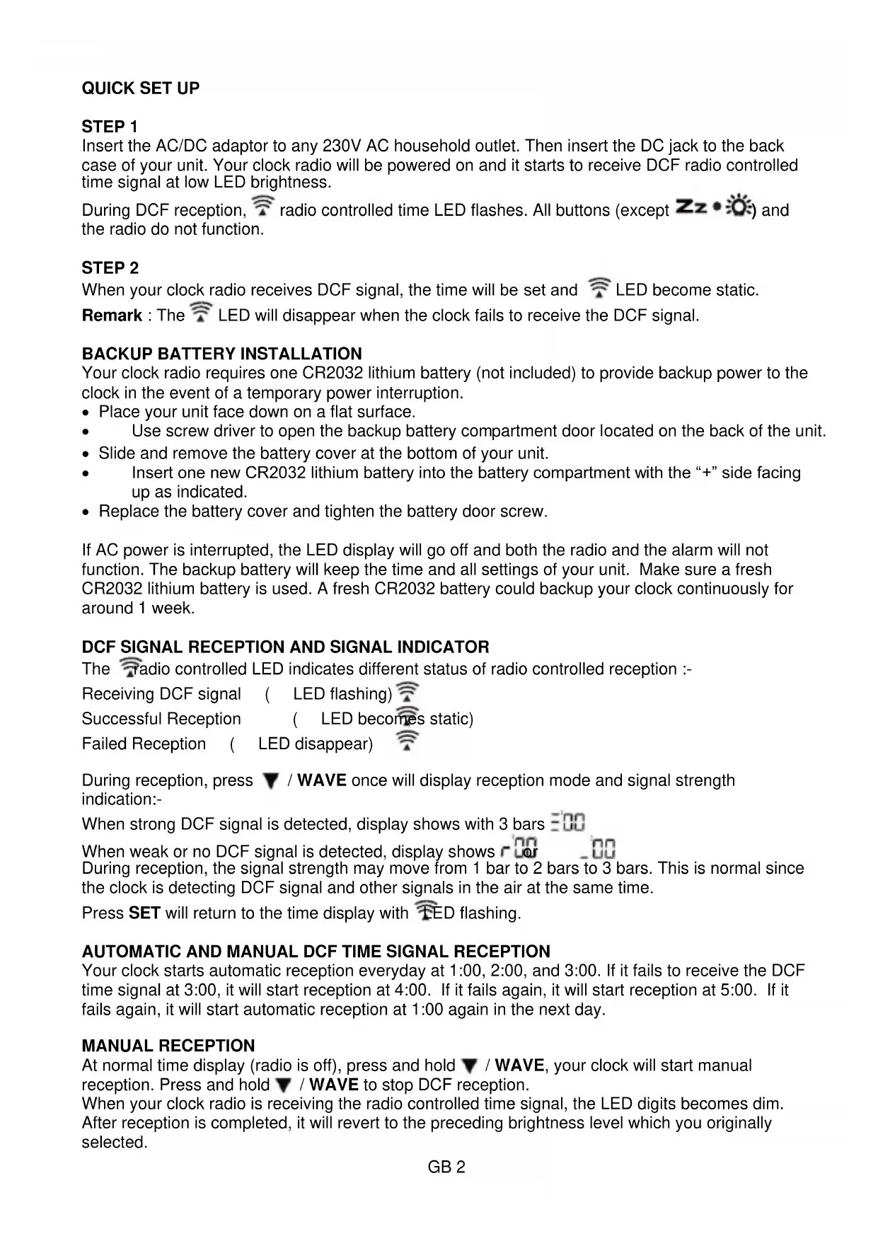 The radio controlled LED indicates different status of radio controlled reception :- Receiving DCF signal ( LED flashing) Successful Reception ( LED becomes static) Failed Reception ( LED disappear) During reception, press / WAVE once will display reception mode and signal strength indication:- When strong DCF signal is detected, display shows with 3 bars When weak or no DCF signal is detected, display shows or During reception, the signal strength may move from 1 bar to 2 bars to 3 bars. This is normal since the clock is detecting DCF signal and other signals in the air at the same time. Press SET will return to the time display with LED flashing. AUTOMATIC AND MANUAL DCF TIME SIGNAL RECEPTION Your clock starts automatic reception everyday at 1:00, 2:00, and 3:00. If it fails to receive the DCF time signal at 3:00, it will start reception at 4:00. If it fails again, it will start reception at 5:00. If it fails again, it will start automatic reception at 1:00 again in the next day. MANUAL RECEPTION At normal time display (radio is off), press and hold / WAVE, your clock will start manual reception. Press and hold / WAVE to stop DCF reception. When your clock radio is receiving the radio controlled time signal, the LED digits becomes dim. After reception is completed, it will revert to the preceding brightness level which you originally selected.GB 3