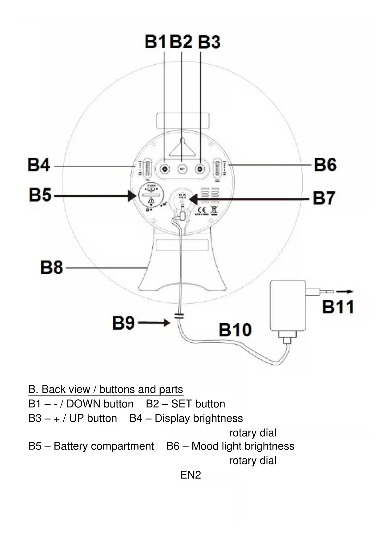 B. Back view / buttons and parts B1 – - / DOWN button B2 – SET button B3 – + / UP button B4 – Display brightness rotary dial B5 – Battery compartment B6 – Mood light brightness rotary dialEN3 B7 – DC power socket B8 – Stand B9 – 3- meter white power cable B10 – AC/DC power adapter B11 – AC power socket To power the clock Plug in the 5V-1.2A AC/DC adaptor HX075B-0501200-AG-001 (included) to an AC wall outlet and then the DC jack to the DC power socket on the back of your clock. To install back-up batteries Your clock requires 1 x CR2032 battery (not included) to provide backup power to it in the event of a temporary power interruption.