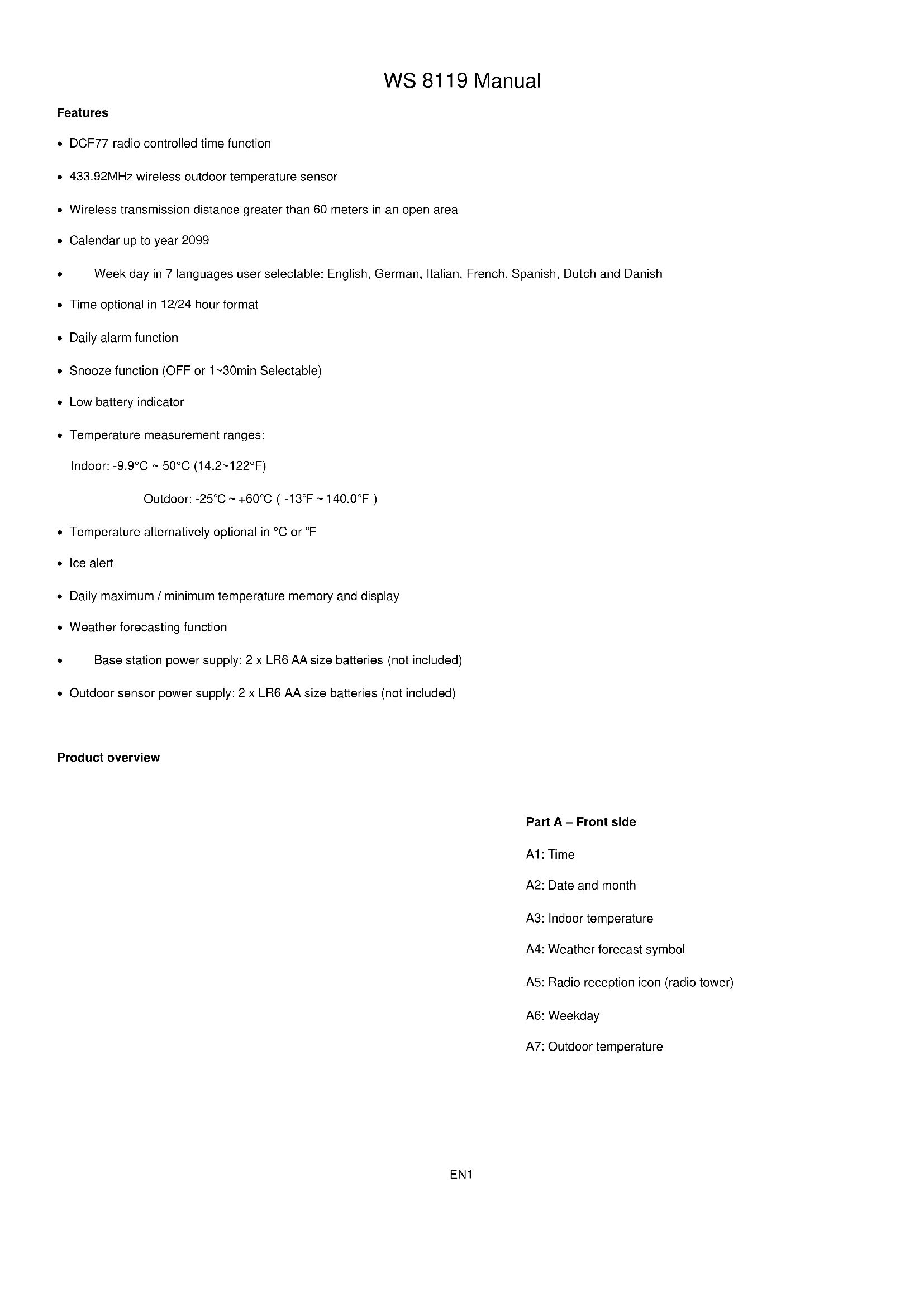 Initial operation Open the base station battery compartment cover Insert 2 x AA batteries with correct polarity (“+” and “–“ marks). Close the battery compartment cover. When you insert the batteries, all icons on the LCD will light up for 3 seconds, and you will hear a beep tone, then indoor temperature will appear. The base station will start to make a connection to the outdoor sensor. This operation takes about 3 minutes and will display by a flashing reception RF antenna symbol in the “OUTDOOR” display area on the receiver. Open the outdoor sensor battery compartment cover and insert 2 x AA batteries with correct polarity (“+” and “–“ marks). Close the battery compartment cover. After the station has created a connection to the outdoor sensor, it will enter the DCF77 time reception mode 3 minutes later.EN3 Reception of the radio controlled time signal (DCF77) The weather station will enter radio controlled time mode after receiving outdoor temperature for 3 minutes. At 1:00 /2:00 / 3:00 AM every day, the clock automatically carries out the synchronization procedure with the DCF77 signal to correct any deviations to the exact time, If this synchronization attempt is unsuccessful, the radio mast icon disappears from the display, the system will automatically attempt another synchronization at the next full one hour, This procedure is repeated automatically up to total 5 times. To manually start the DCF77 signal reception, press and hold the B3 button for 3 seconds. If no signals is received within 7 minutes, then the DCF77 signal search stops and start again at the next full one hour. To stop the signal search during DCF77 reception, press the B3 button once. Notes: A flashing radio mast icon indicates that the DCF signal reception has started A continuously displayed radio mast icon indicates that the DCF signal was received successfully We recommend a minimum distance of 2.5 meters to all sources of interference, such as televisions or computer monitors Radio reception is weaker in rooms with concrete walls (e.g.: in cellars) and in offices. In such circumstances, place the system close to the window. During the DCF77 reception mode, only the B3 button is functional, other buttons are not functional, If you want to carry out other functions of operation, please press the B3 button to exit the DCF77 reception mode. Manual time setting Press and hold the B5 button for 3 seconds, the “ON/OFF ”display starts to flash. Now use “ ” or “ ” buttons to set the radio control function ON or OFF. Press the SET button to confirm the item has been set and go to the next one, the sequence of setting items is as follows: RCC ON/OFF TIME format(12/24HR) ZONE(-12~12) HOUR MINUTE DATE format(D/M or M/D) YEAR MONTH DATE Language of week Unit of temperature(°C/°F) Pattern of weather Complete setup and exit the setting mode When adjusting the value, you can add or subtract 1 by pressing or button once, and quickly add or subtract by pressing and hold it. Weekday language settings are shown in the table below:EN4 Language Sunday Monday Tuesday Wednesday Thursday Friday Saturday German GER SON MON DIE MIT DON FRE SAM English ENG SUN MON TUE WED THU FRI SAT French FRE DIM LUN MAR MER JEU VEN SAM Italian ITA DOM LUN MAR MER GIO VEN SAB Spanish SPA DOM LUN MAR MIE JUE VIE SAB Dutch DUT ZON MAA DIN WOE DON VRI ZAT Danish DAN SON MAN TIR ONS TOR FRE LOR If there is no valid operation within 20 seconds, it will automatically return to normal time mode from the set mode. Setting the daily alarms Press B3 button once, LCD display the icon , the alarm function is ON, then press once button, the icon will disappears from the LCD, the alarm function is OFF. Press the SET button once and the LCD displays “6:30AL” (alarm time), then press and hold the SET button for 3 seconds until hour of the alarm time starts to flash. Use the “ ” or “ ” buttons to set the required hour. Press SET button to confirm your setting, and the minute of the alarm time starts to flash. Use the “ ” or “ ” button to set the required minute. Press SET button to confirm your setting, the snooze time of the alarm starts to flash. Use the “ ” or “ ” button to set the duration of snooze time. Press SET button to confirm your setting and to end the setting procedure. When adjusting the value, press and hold the “ ” or “ ”button to adjust continuously and quickly Notes: If there is no valid operation within 20 seconds, it will automatically return to normal time mode from the alarm time set mode. The alarm will sound for 2 minutes if you do not deactivate it by pressing any button. In this case the alarm will be repeated automatically after 24 hours. When the alarm time is reached, a gradual beep sound will be emitted. Switching off the alarm signal While the alarm was sounding, press any buttons except the B2 to stop the alarm signal. It is not necessary to reactivate the alarm. The clock switches itself automatically to the alarm time which has already been set. Snooze functionEN5 While the alarm was sounding, press the B2 button the alarm signal sounds to get to SNOOZE mode. The alarm signal sounds again after the set snooze time. Outdoor sensor reception The weather station automatically starts receiving transmission from remote sensor for outdoor temperature after batteries inserted. The remote sensor will automatically transmit temperature signal to the base station after batteries inserted. If the base station failed to receive transmission from remote sensor (“- -.-”display on the LCD), press and hold B4 button for 3 seconds to receive transmission manually. RF icon flashes on the LCD,the base station to receive the remote sensor. Maximum/minimum temperature The weather station records maximum and minimum temperature values. Press the B1 button once to display the maximum values of temperature with MAX symbol. Press the B1 again to display the minimum values of tempe