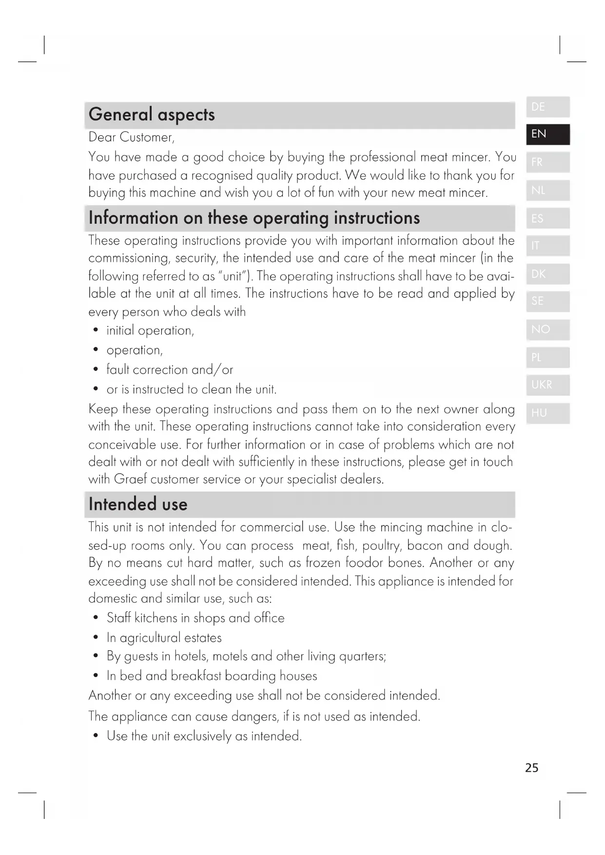 - or is instructed to clean the unit. Keep these operating instructions and pass them on to the next owner along with the unit. These operating instructions cannot take into consideration every conceivable use. For further information or in case of problems which are not dealt with or not dealt with sufficiently in these instructions, please get in touch with Graef customer service or your specialist dealers. Intended use This unit is not intended for commercial use. Use the mincing machine in clo- sed-up rooms only. You can process meat, fish, poultry, bacon and dough. By no means cut hard matter, such as frozen foodor bones. Another or any exceeding use shall not be considered intended. This appliance is intended for domestic and similar use, such as: