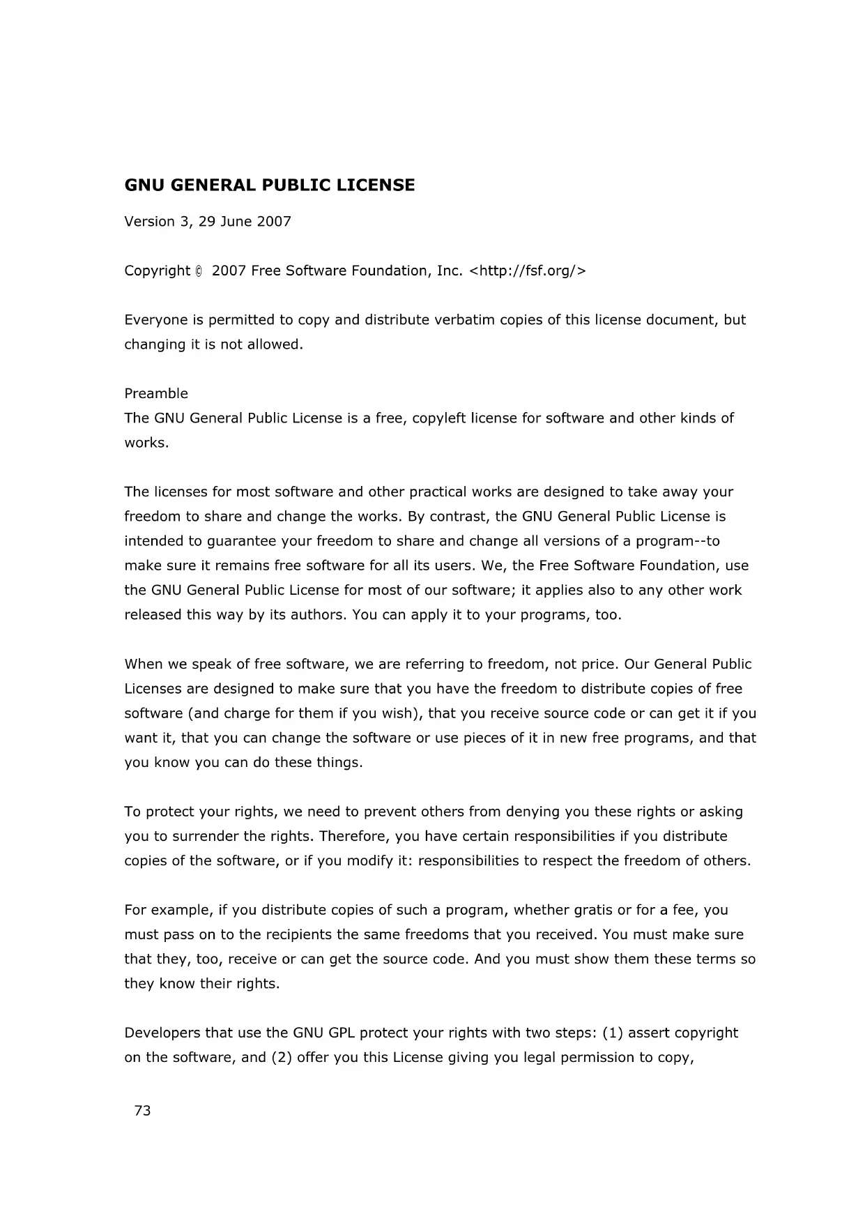 Version 3, 29 June 2007 Copyright © 2007 Free Software Foundation, Inc. <http://fsf.org/> Everyone is permitted to copy and distribute verbatim copies of this license document, but changing it is not allowed. Preamble The GNU General Public License is a free, copyleft license for software and other kinds of works. The licenses for most software and other practical works are designed to take away your freedom to share and change the works. By contrast, the GNU General Public License is intended to guarantee your freedom to share and change all versions of a program--to make sure it remains free software for all its users. We, the Free Software Foundation, use the GNU General Public License for most of our software; it applies also to any other work released this way by its authors. You can apply it to your programs, too. When we speak of free software, we are referring to freedom, not price. Our General Public Licenses are designed to make sure that you have the freedom to distribute copies of free software (and charge for them if you wish), that you receive source code or can get it if you want it, that you can change the software or use pieces of it in new free programs, and that you know you can do these things. To protect your rights, we need to prevent others from denying you these rights or asking you to surrender the rights. Therefore, you have certain responsibilities if you distribute copies of the software, or if you modify it: responsibilities to respect the freedom of others. For example, if you distribute copies of such a program, whether gratis or for a fee, you must pass on to the recipients the same freedoms that you received. You must make sure that they, too, receive or can get the source code. And you must show them these terms so they know their rights. Developers that use the GNU GPL protect your rights with two steps: (1) assert copyright on the software, and (2) offer you this License giving you legal permission to copy,74 distribute and/or modify it. For the developers' and authors' protection, the GPL clearly explains that there is no warranty for this free software. For both users' and authors' sake, the GPL requires that modified versions be marked as changed, so that their problems will not be attributed erroneously to authors of previous versions. Some devices are designed to deny users access to install or run modified versions of the software inside them, although the manufacturer can do so. This is fundamentally incompatible with the aim of protecting users' freedom to change the software. The systematic pattern of such abuse occurs in the area of products for individuals to use, which is precisely where it is most unacceptable. Therefore, we have designed this version of the GPL to prohibit the practice for those products. If such problems arise substantially in other domains, we stand ready to extend this provision to those domains in future versions of the GPL, as needed to protect the freedom of users. Finally, every program is threatened constantly by software patents. States should not allow patents to restrict development and use of software on general-purpose computers, but in those that do, we wish to avoid the special danger that patents applied to a free program could make it effectively proprietary. To prevent this, the GPL assures that patents cannot be used to render the program non-free. The precise terms and conditions for copying, distribution and modification follow.
