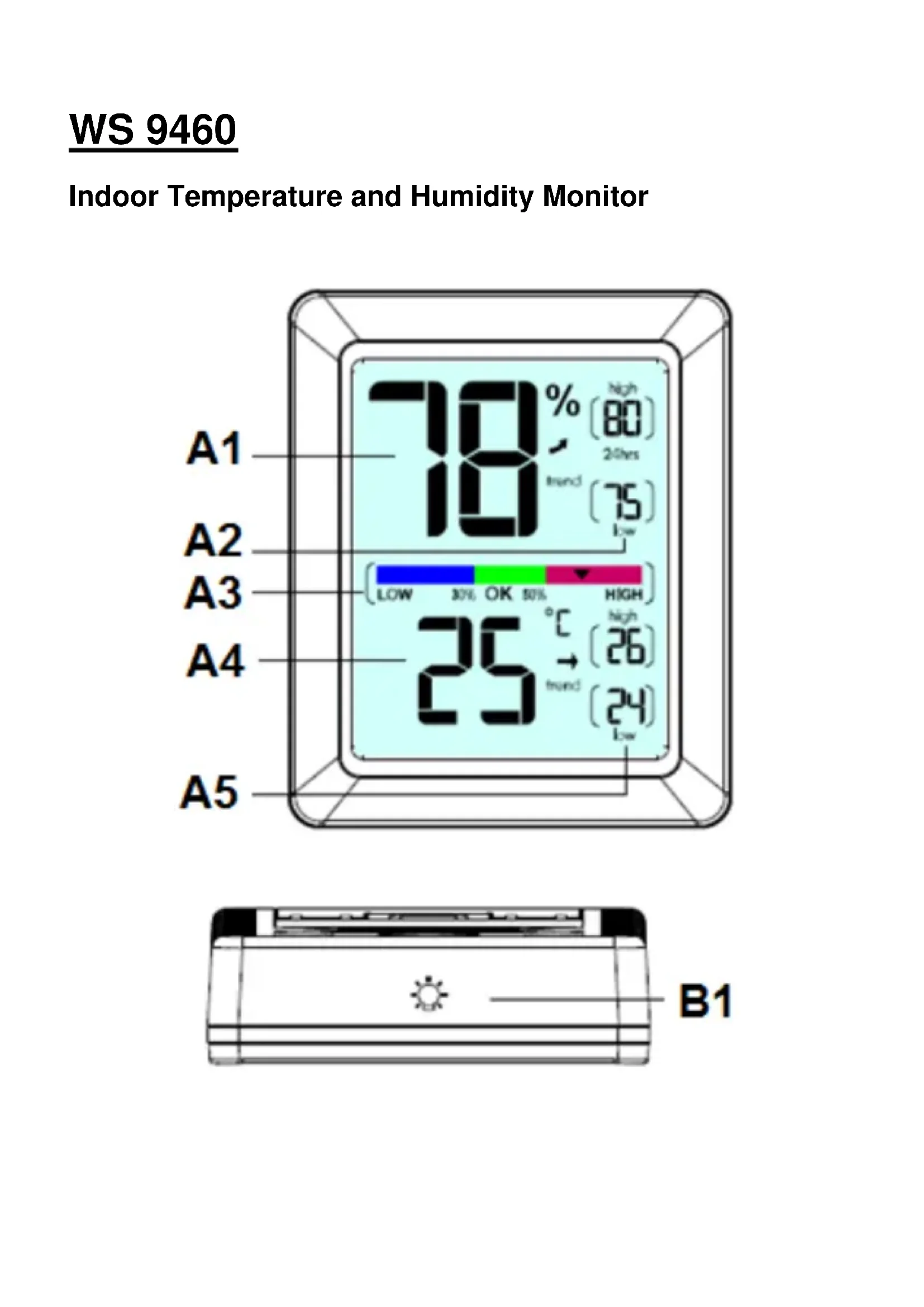 To select between degrees Fahrenheit (°F) or Celsius (°C) temperature units, press the “°C/°F” button (B5) located on the back of the unit Placement for Maximum Accuracy Placement in a proper location is critical to the accuracy and performance of this product. Place the monitor in a dry area free of dirt and dust. To ensure accurate temperature measurement, place monitor out of direct sunlight and away from any heat source or vents. To ensure accurate humidity measurement, place monitor away from humidity sources. The monitor comes with 2 magnets on the backside to stick on the fridge. (B7) OPERATION Using the Humidity Monitor / Humidity Level Indicator The Humidity Level Indicator easily conveys a low, high or ideal indoor humidity level for your home and health. High & Low Records High and low records are displayed for temperature and humidity. 24-hour records automatically clear every 24 hours since the batteries were installed.All-time records are the maximum and minimum readings recorded since the batteries were installed. To check the High & Low records in 24-hours or All-time, press UP (B3) or DOWN (B4) buttons. To manually clear the high records currently being viewed, hold the UP button (B3) for few seconds. To manually clear the low records currently being viewed, hold the DOWN button (B4) for few seconds. Calibration The temperature and humidity readings can be calibrated on the display to improve accuracy. Calibration can improve accuracy when product placement or environment factors impact your measuring accuracy.