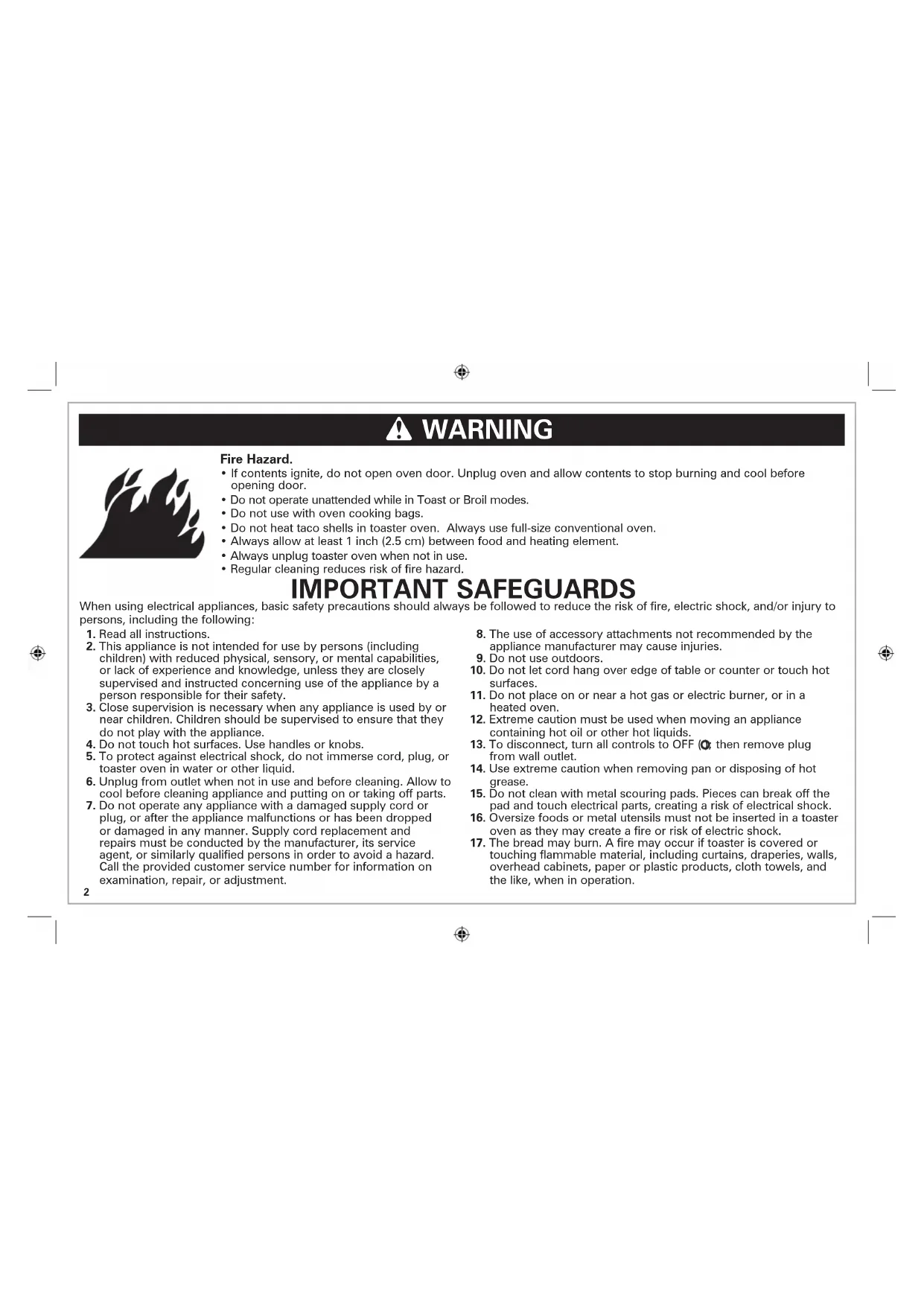 17. The bread may burn. A fire may occur if toaster is covered or