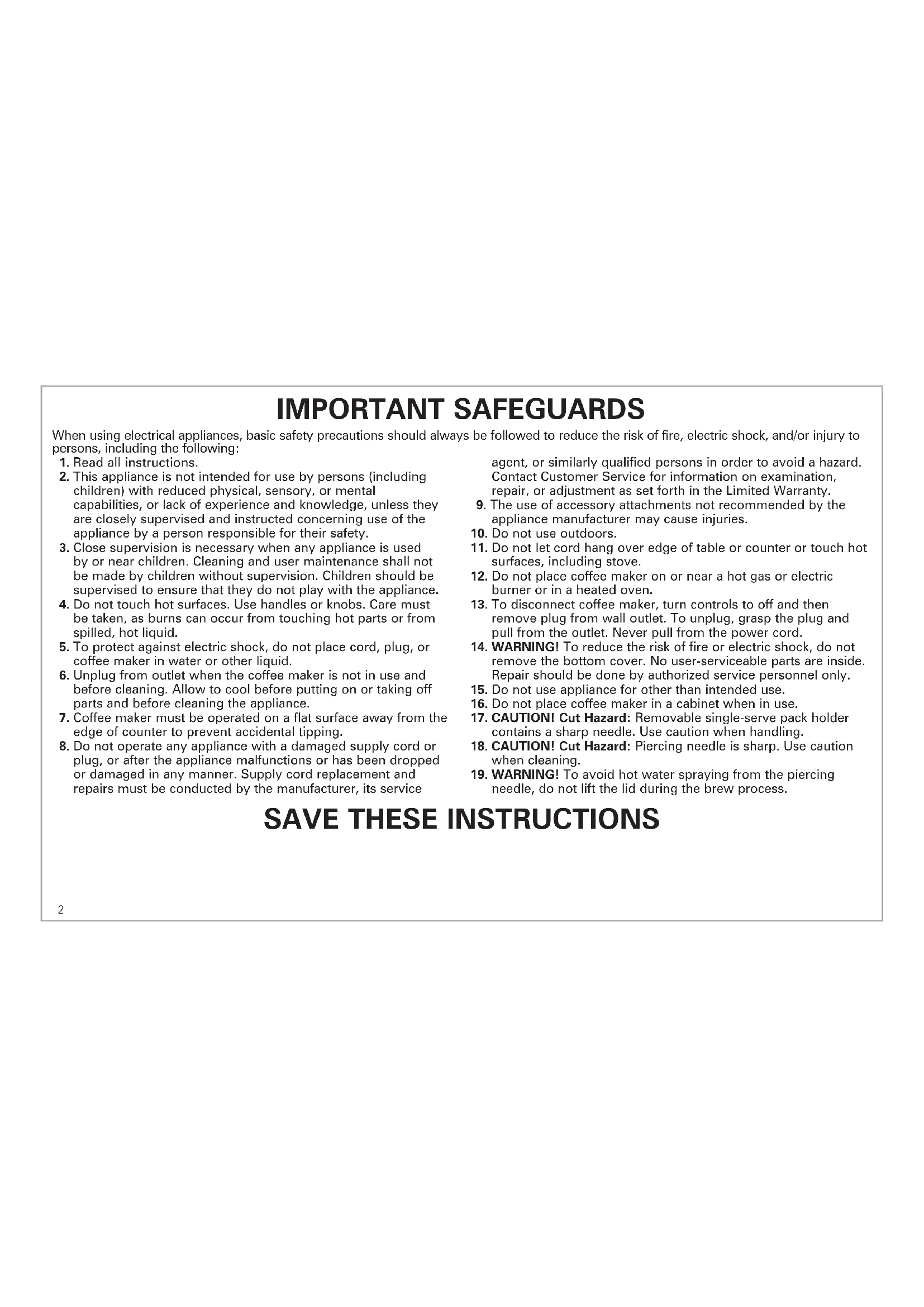 needle, do not lift the lid during the brew process. When using electrical appliances, basic safety precautions should always be followed to reduce the risk of fire, electric shock, and/or injury to persons, including the following: