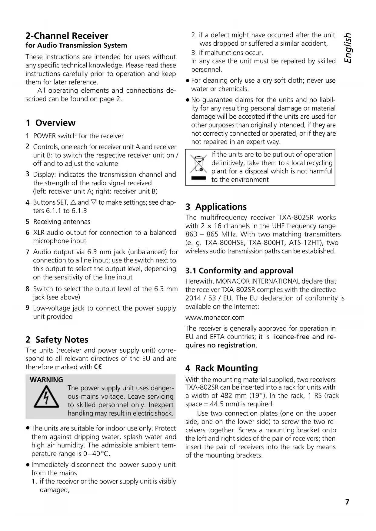 Herewith, MONACOR INTERNATIONAL declare that the receiver TXA-802SR complies with the directive 2014 / 53 / EU. The EU declaration of conformity is available on the Internet: www.monacor.com The receiver is generally approved for operation in EU and EFTA countries; it is licence-free and re- quires no registration. 4 Rack Mounting With the mounting material supplied, two receivers TXA-802SR can be inserted into a rack for units with a width of 482 mm (19”). In the rack, 1 RS (rack space = 44.5 mm) is required. Use two connection plates (one on the upper side, one on the lower side) to screw the two re- ceivers together. Screw a mounting bracket onto the left and right sides of the pair of receivers; then insert the pair of receivers into the rack by means of the mounting brackets.8 English 5 Setting the Receiver intoOperation