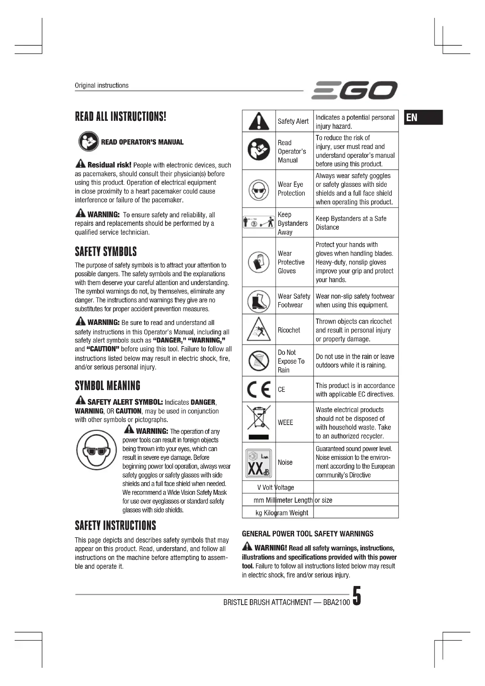 power tools can result in foreign objects being thrown into your eyes, which can result in severe eye damage. Before beginning power tool operation, always wear safety goggles or safety glasses with side shields and a full face shield when needed. We recommend a Wide Vision Safety Mask for use over eyeglasses or standard safety glasses with side shields. SAFETY INSTRUCTIONS This page depicts and describes safety symbols that may appear on this product. Read, understand, and follow all instructions on the machine before attempting to assem-ble and operate it.Safety AlertIndicates a potential personal injury hazard.Read Operator’s ManualTo reduce the risk of injury, user must read and understand operator’s manual before using this product.Wear Eye ProtectionAlways wear safety goggles or safety glasses with side shields and a full face shield when operating this product.Keep Bystanders Away Keep Bystanders at a Safe DistanceWear Protective GlovesProtect your hands with gloves when handling blades. Heavy-duty, nonslip gloves improve your grip and protect your hands.Wear Safety FootwearWear non-slip safety footwear when using this equipment.RicochetThrown objects can ricochet and result in personal injury or property damage.Do Not Expose To Rain Do not use in the rain or leave outdoors while it is raining. This product is in accordance with applicable EC directives. WEEE Waste electrical products should not be disposed of with household waste. Take to an authorized recycler.