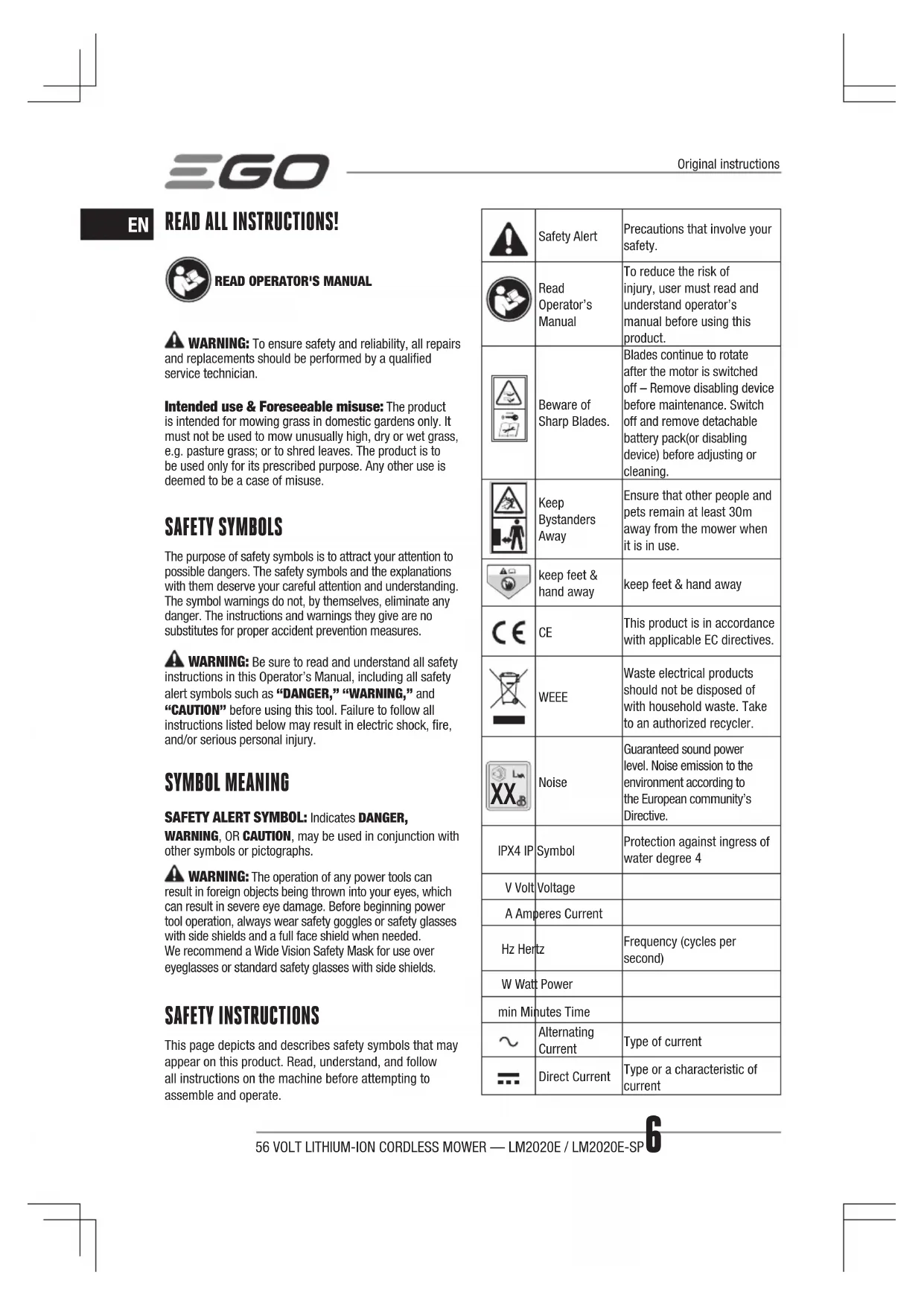 NoiseGuaranteed sound power level. Noise emission to the environment according to the European community’s Directive.IPX4 IP SymbolProtection against ingress of water degree 4V Volt VoltageA Amperes CurrentHz HertzFrequency (cycles per second)W Watt Powermin Minutes TimeAlternating CurrentType of currentDirect CurrentType or a characteristic of currentOriginal instructions56 VOLT LITHIUM-ION CORDLESS MOWER — LM2020E / LM2020E-SP 7