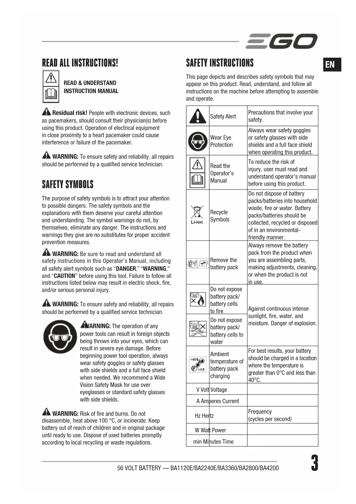 disassemble, heat above 100 °C, or incinerate. Keep battery out of reach of children and in original package until ready to use. Dispose of used batteries promptly according to local recycling or waste regulations. SAFETY INSTRUCTIONS This page depicts and describes safety symbols that may appear on this product. Read, understand, and follow all instructions on the machine before attempting to assemble and operate. Safety Alert Precautions that involve your safety. Wear Eye Protection Always wear safety goggles or safety glasses with side shields and a full face shield when operating this product. Read the Operator’s Manual To reduce the risk of injury, user must read and understand operator’s manual before using this product. Li-ion Recycle Symbols Do not dispose of battery packs/batteries into household waste, re or water. Battery packs/batteries should be collected, recycled or disposed of in an environmental- friendly manner. Remove the battery pack Always remove the battery pack from the product when you are assembling parts, making adjustments, cleaning, or when the product is not in use. Do not expose battery pack/ battery cells to re Against continuous intense sunlight, re, water, and moisture. Danger of explosion. Do not expose battery pack/ battery cells to water Ambient temperature of battery pack charging For best results, your battery should be charged in a location where the temperature is greater than 0°C and less than 40°C. V Volt Voltage A Amperes Current Hz Hertz Frequency (cycles per second) W Watt Power min Minutes Time56 VOLT BATTERY — BA1120E/BA2240E/BA3360/BA2800/BA42004