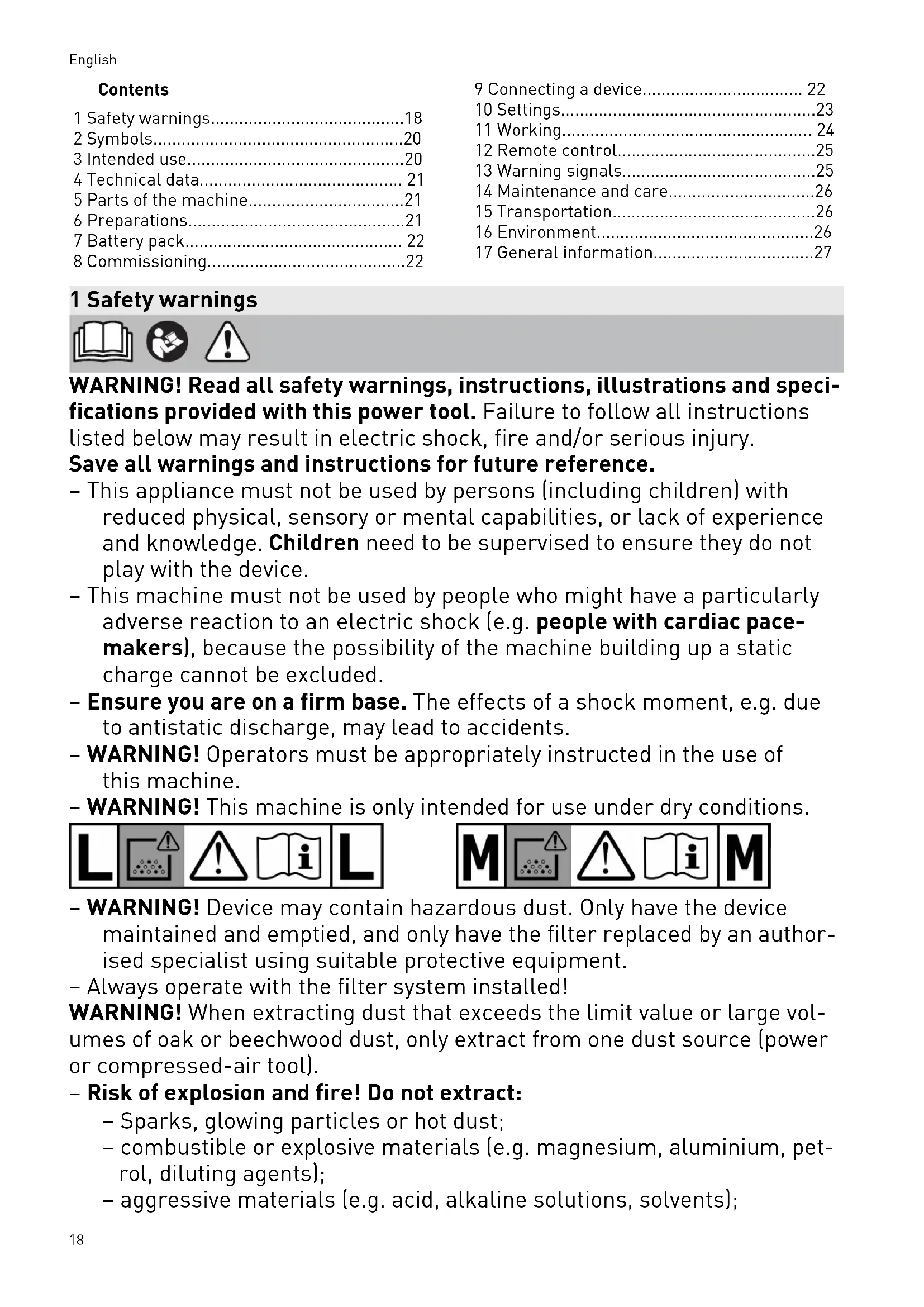 WARNING! Device may contain hazardous dust. Only have the device maintained and emptied, and only have the filter replaced by an authorised specialist using suitable protective equipment.
