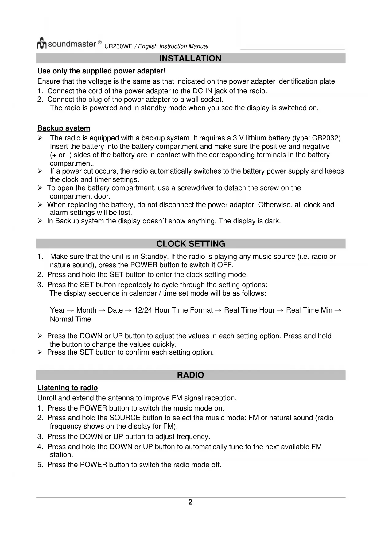 UR230WE - Radio Soundmaster - Free user manual and instructions