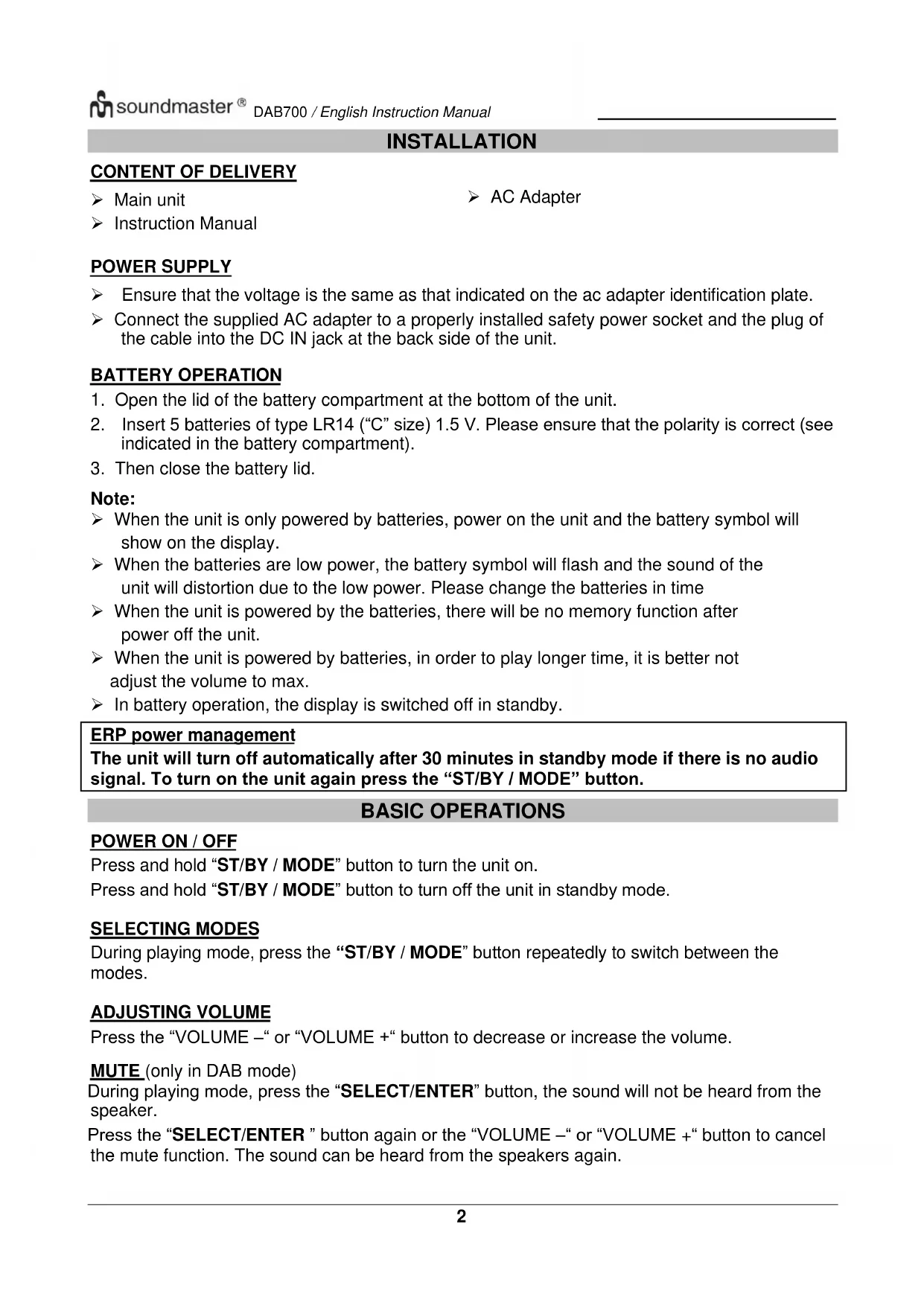 Note: ➢ When the unit is only powered by batteries, power on the unit and the battery symbol will show on the display. ➢ When the batteries are low power, the battery symbol will flash and the sound of the unit will distortion due to the low power. Please change the batteries in time ➢ When the unit is powered by the batteries, there will be no memory function after power off the unit. ➢ When the unit is powered by batteries, in order to play longer time, it is better not adjust the volume to max. ➢ In battery operation, the display is switched off in standby. ERP power management The unit will turn off automatically after 30 minutes in standby mode if there is no audio signal. To turn on the unit again press the “ST/BY / MODE” button. BASIC OPERATIONS