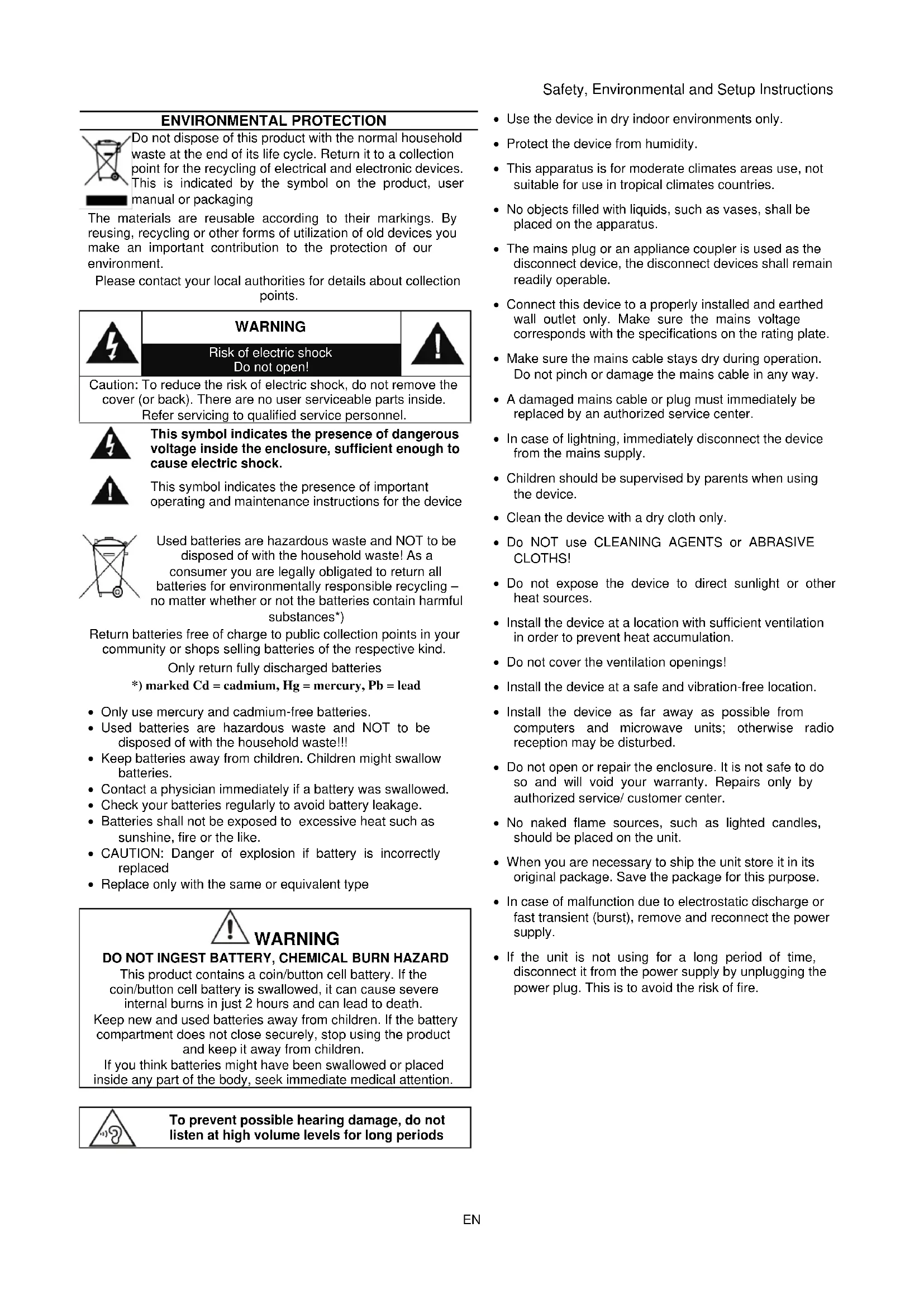 Only use mercury and cadmium-free batteries. Used batteries are hazardous waste and NOT to be disposed of with the household waste!!! Keep batteries away from children. Children might swallow batteries. Contact a physician immediately if a battery was swallowed. Check your batteries regularly to avoid battery leakage. Batteries shall not be exposed to excessive heat such as sunshine, fire or the like. CAUTION: Danger of explosion if battery is incorrectly replaced Replace only with the same or equivalent type