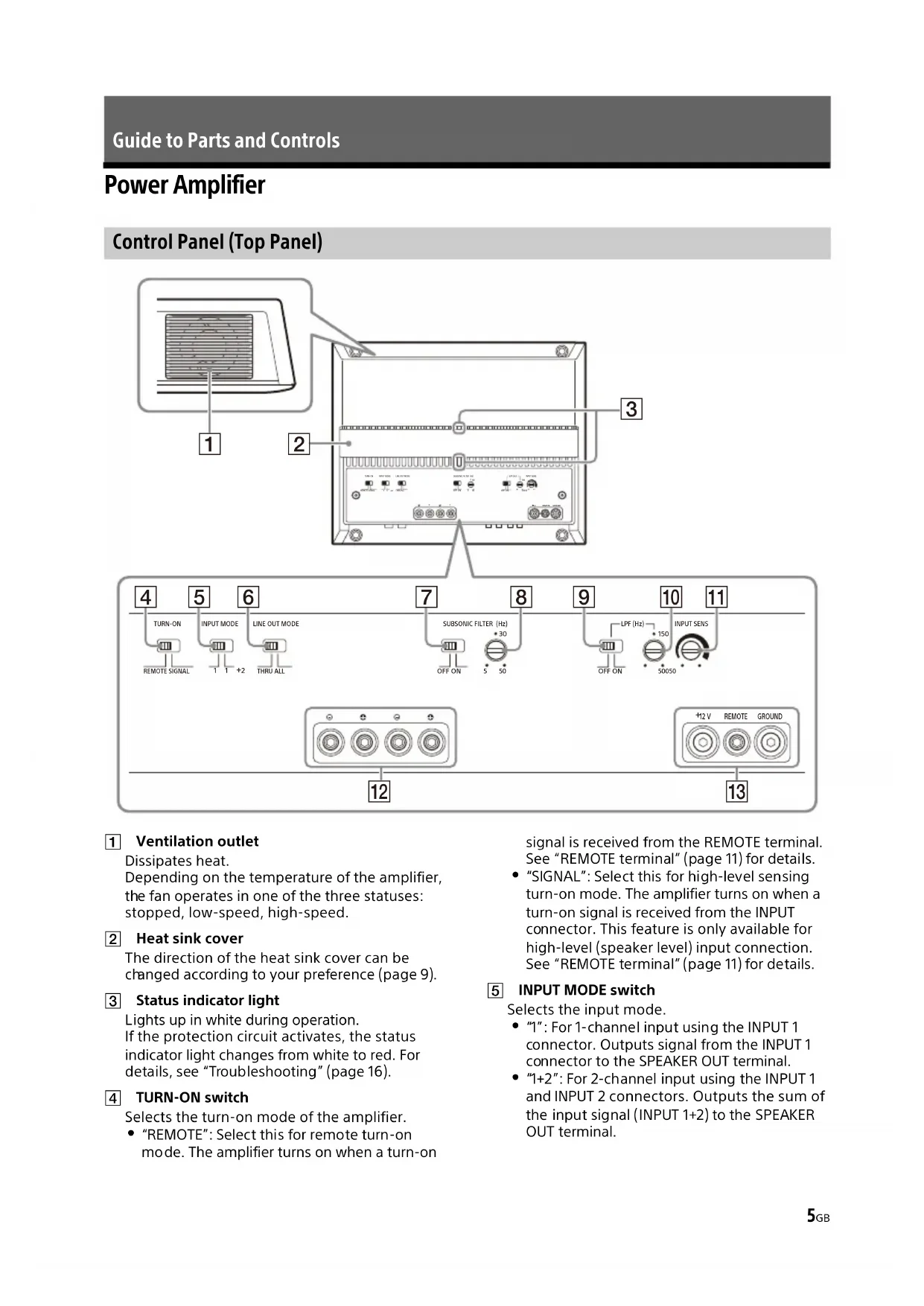 nnector. This feature is only available for high-level (speaker level) input connection. See “REMOTE terminal” (page 11) for details. INPUT MODE switch Selects the input mode. “1”: For 1-channel input using the INPUT 1