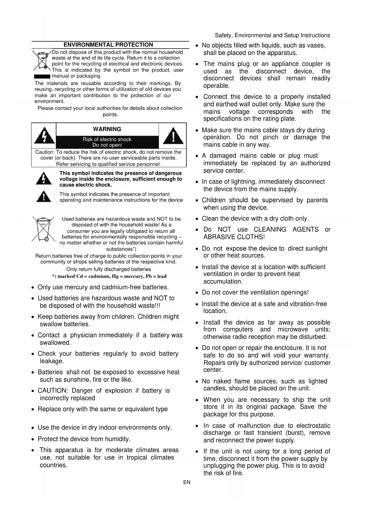 Only use mercury and cadmium-free batteries. Used batteries are hazardous waste and NOT to be disposed of with the household waste!!! Keep batteries away from children. Children might swallow batteries. Contact a physician immediately if a battery was swallowed. Check your batteries regularly to avoid battery leakage. Batteries shall not be exposed to excessive heat such as sunshine, fire or the like. CAUTION: Danger of explosion if battery is incorrectly replaced Replace only with the same or equivalent type