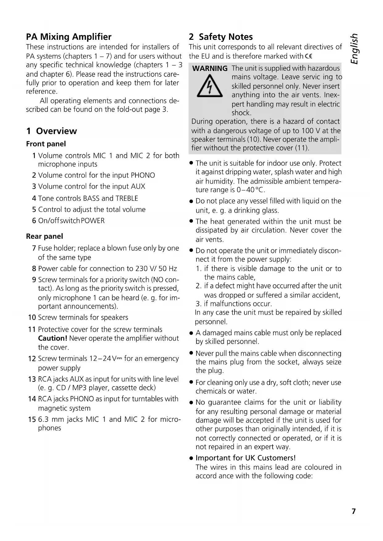 phones 2 Safety Notes This unit corresponds to all relevant directives of the EU and is therefore marked with . WARNING The unit is supplied with hazardous mains voltage. Leave servic ing to skilled personnel only. Never insert anything into the air vents. Inex- pert handling may result in electric shock. During operation, there is a hazard of contact with a dangerous voltage of up to 100 V at the speaker terminals (10). Never operate the ampli- fier without the protective cover (11).