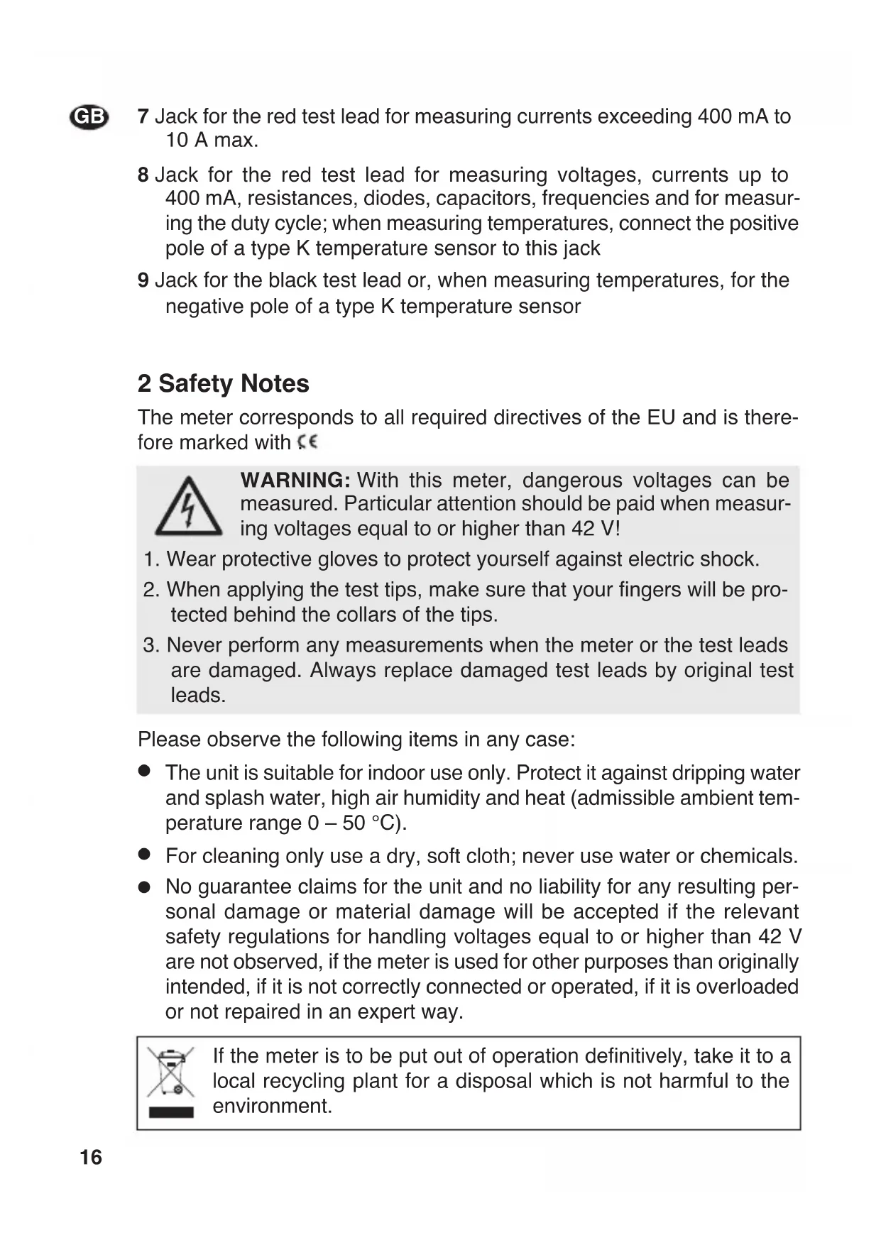 No guarantee claims for the unit and no liability for any resulting per- sonal damage or material damage will be accepted if the relevant safety regulations for handling voltages equal to or higher than 42 V are not observed, if the meter is used for other purposes than originally intended, if it is not correctly connected or operated, if it is overloaded or not repaired in an expert way. If the meter is to be put out of operation definitively, take it to a local recycling plant for a disposal which is not harmful to the environment.