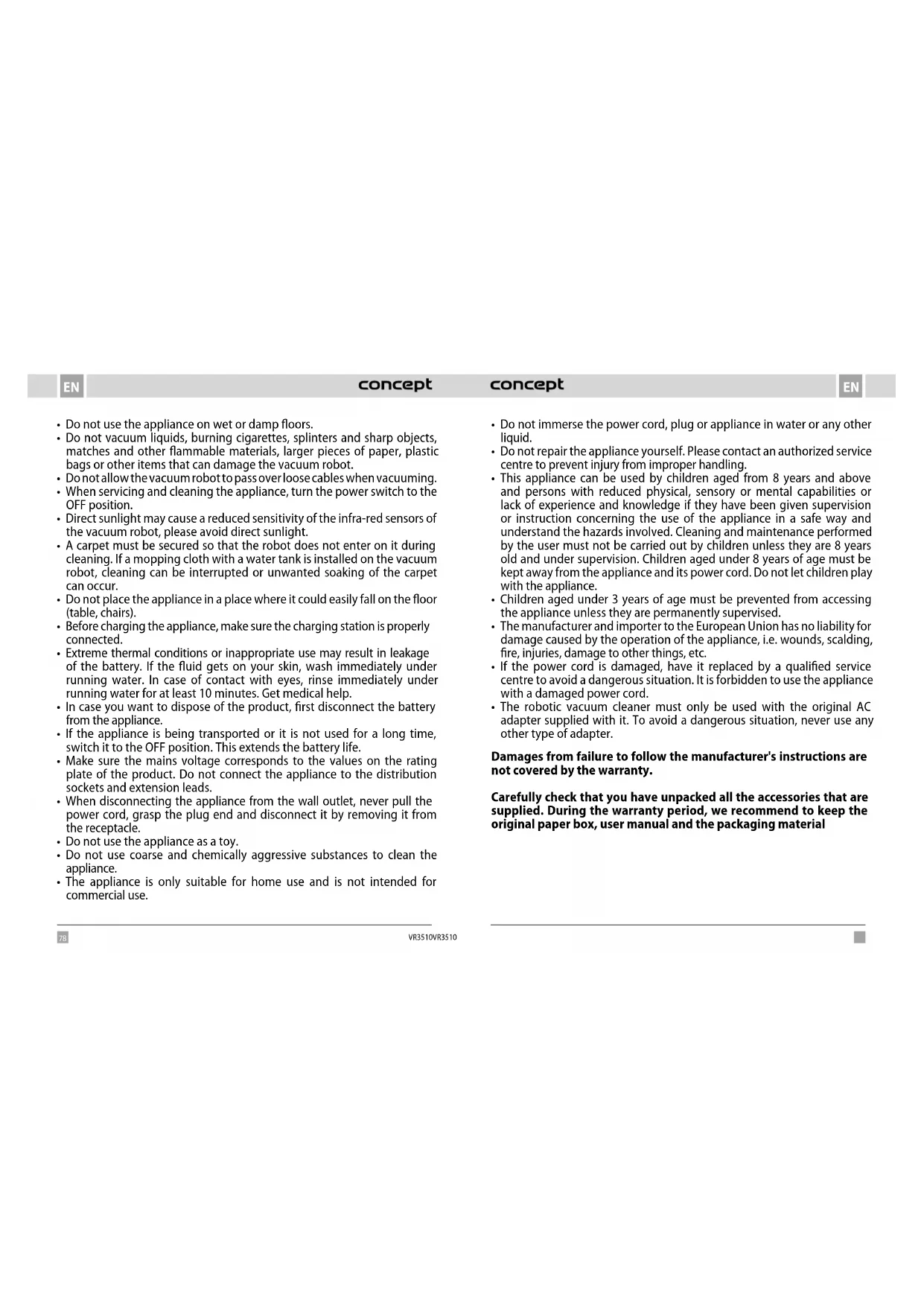 - The robotic vacuum cleaner must only be used with the original AC adapter supplied with it. To avoid a dangerous situation, never use any other type of adapter. Damages from failure to follow the manufacturer's instructions are not covered by the warranty. Carefully check that you have unpacked all the accessories that are supplied. During the warranty period, we recommend to keep the original paper box, user manual and the packaging material80 81 ENEN VR3510 VR3510 PRODUCT DESCRIPTION 1 LDS laser range-finder 2 Anti-collision sensor for radar sensor 3 Anti-collision sensors 4 Infra-red charging sensor 5 Cliff sensors 6 Charging contact 7 Universal wheel