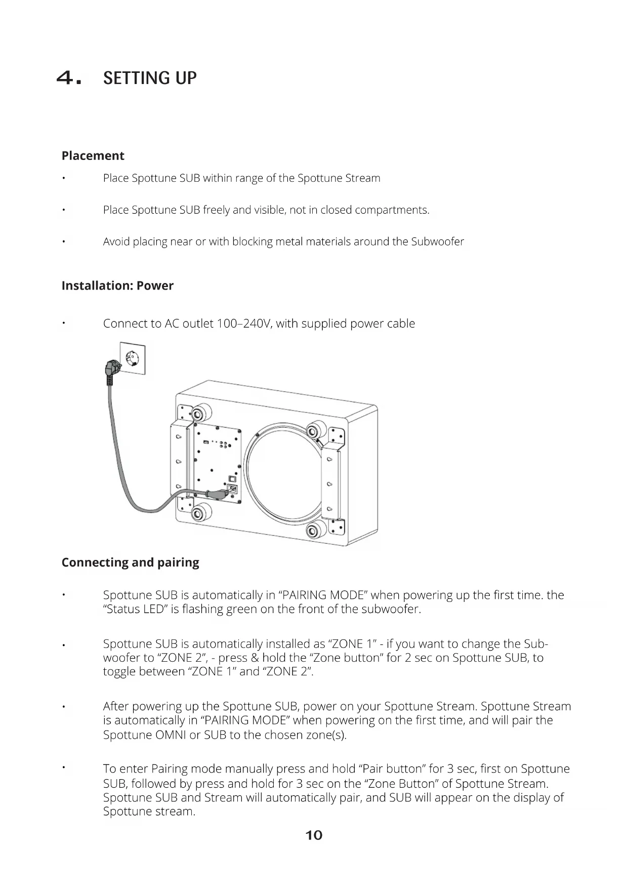 Connect to AC outlet 100–240V, with supplied power cable Connecting and pairing Spottune SUB is automatically in “PAIRING MODE” when powering up the rst time. the “Status LED” is ashing green on the front of the subwoofer. Spottune SUB is automatically installed as “ZONE 1” - if you want to change the Sub- woofer to “ZONE 2”, - press & hold the “Zone button” for 2 sec on Spottune SUB, to toggle between “ZONE 1” and “ZONE 2”. After powering up the Spottune SUB, power on your Spottune Stream. Spottune Stream is automatically in “PAIRING MODE” when powering on the rst time, and will pair the Spottune OMNI or SUB to the chosen zone(s). To enter Pairing mode manually press and hold “Pair button” for 3 sec, rst on Spottune SUB, followed by press and hold for 3 sec on the “Zone Button” of Spottune Stream. Spottune SUB and Stream will automatically pair, and SUB will appear on the display of Spottune stream.