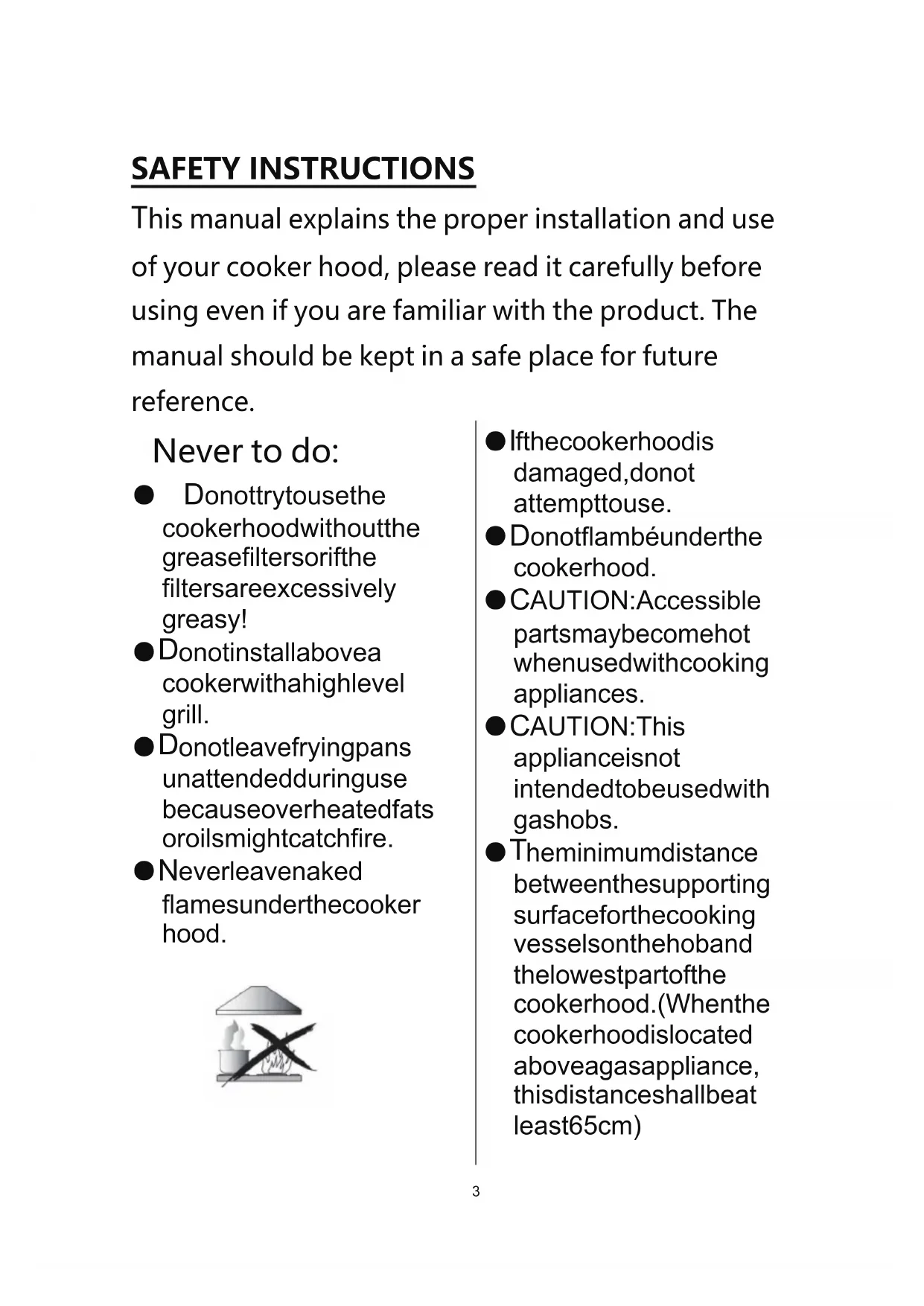 DE1 Cooker Hood Instruction Manual2 Content 1…………………………………..………………………Safety instructions 2…………………………………..………………………Installation 3…………………………………..………………………Start using your cooker hood 4…………………………………..………………………Troubleshooting 5…………………………………..………………………Maintenance and cleaning 6…………………………………..………………………Environment protection3 SAFETY INSTRUCTIONS This manual explains the proper installation and use of your cooker hood, please read it carefully before using even if you are familiar with the product. The manual should be kept in a safe place for future reference. Never to do: ● Do not try to use the cooker hood without the grease filters or if the filters are excessively greasy!