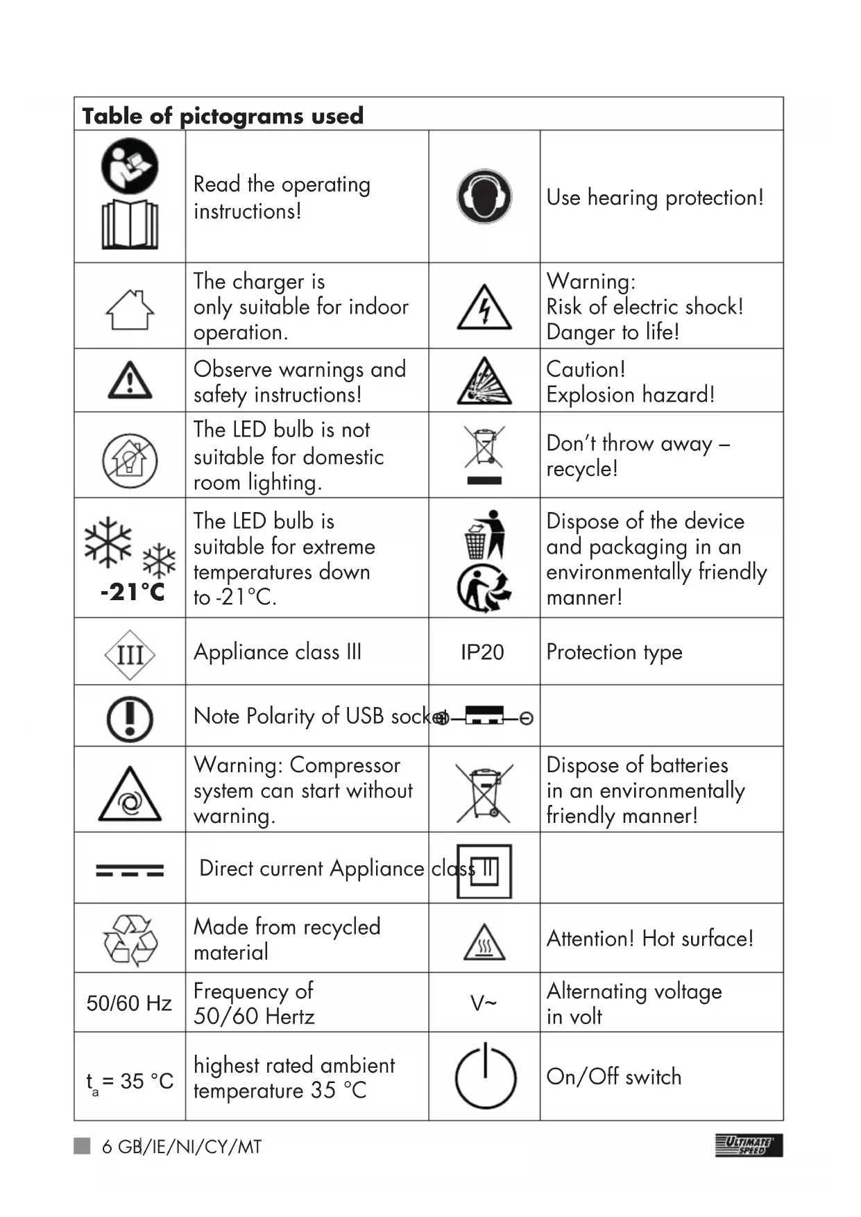 CHILDREN! The jumpstart feature is only for petrol engines with a max. capacity of 3.5 litres and diesel engines with a max. capacity of 2.2 litres. z Intended use This power bank with compressor serves as additional support for 12-V vehicle battery systems during starting problems in diesel and petrol vehicles, which is caused by weak, empty or faulty starter batteries. However, the power bank with compressor cannot replace the vehicle battery. If no more than 400 A are needed for starting (max. peak current), the power bank lets the user single-handedly start the vehicle when necessary, without additional help from a third party. The power bank with compressor is also fitted with two USB ports. This means that mobile phones, satnavs or other USB-enabled devices can also be charged if needed. The integrated compressor is designed to generate pressure in tyres (e.g. vehicle and bicycle tyres), balls and other small-scale inflatable articles. Do not use the compressor to inflate articles with a large volume, since it can overheat rapidly in the absence of back pressure. This power bank with compressor is not designed for continuous operation to generate pressure for more than 7 minutes at a time. The maximum achievable pressure is 3.5 bar. Note: The pressure gauge is not trade-approved. Any other use may cause damage to the device and expose the user to a risk of serious injury. The manufac- turer is not liable for any injury or damage resulting from improper use or incorrect operation. This power bank with compressor is not suitable for commercial use. Commercial use will void the guarantee. The device has been developed for consumer use and is not suitable for use in a commercial or industrial environment. The product must only8 GB/IE/NI/CY/MT be started up initially by people who have been trained to do so. The LED bulb is not suitable for domestic room lighting. -21°C The LED bulb is suitable for extreme temperatures down to -21 °C. z Package contents 1 Power bank with compressor 1 Operating instructions Accessories: 1 Jump lead 1 AC adapter (comprised of plug adapter and USB cable) 3 Valve adapter 1 Compressed air hose z Equipment After unpacking the product, please check that all of the package contents are present and that the power bank with compressor is in perfect condition. Do not use the device if it is defective.