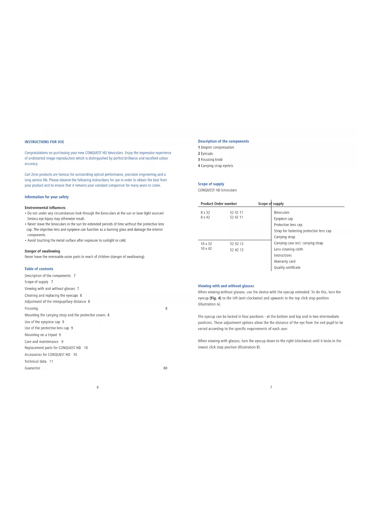 Carl Zeiss products are famous for outstanding optical performance, precision engineering and a long service life. Please observe the following instructions for use in order to obtain the best from your product and to ensure that it remains your constant companion for many years to come.