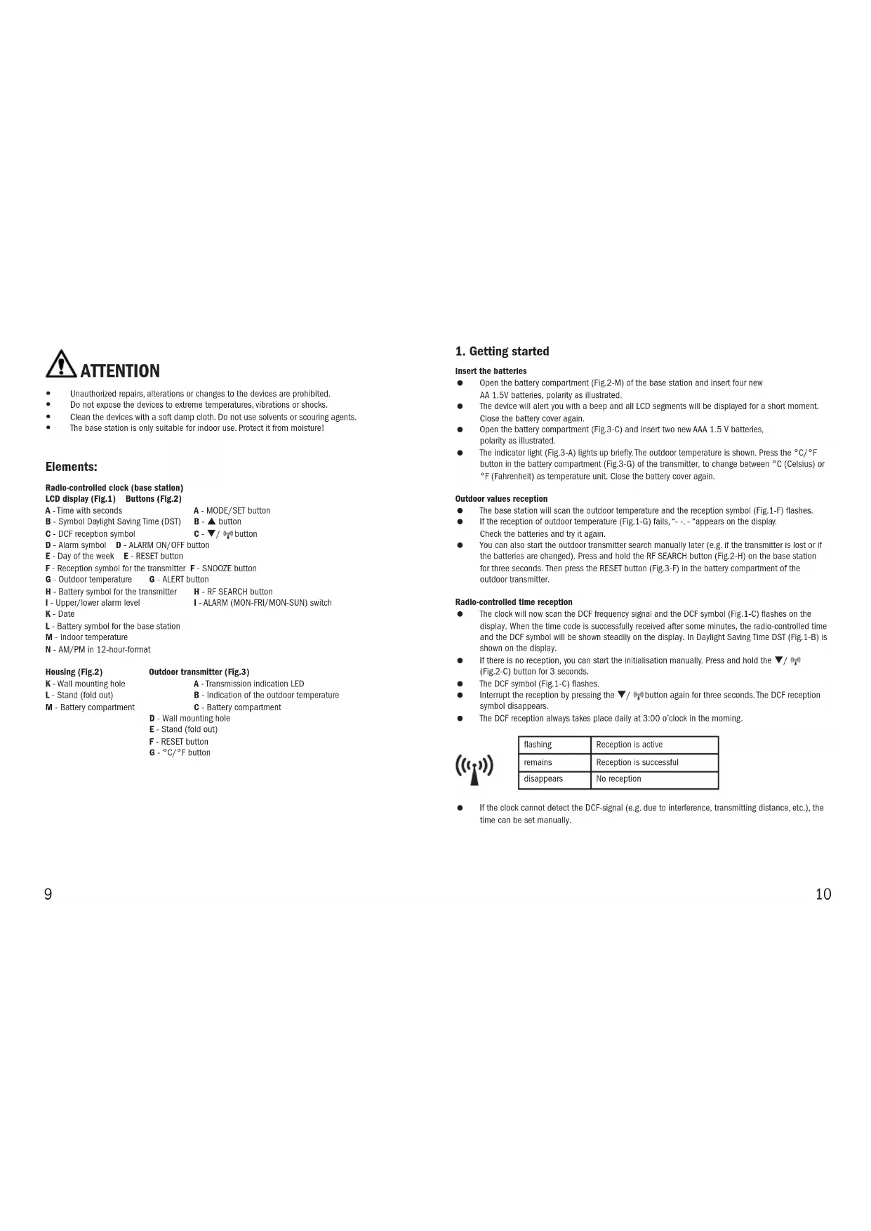 Insert the batteries Open the battery compartment (Fig.2-M) of the base station and insert four new AA 1.5V batteries, polarity as illustrated. The device will alert you with a beep and all LCD segments will be displayed for a short moment. Close the battery cover again. Open the battery compartment (Fig.3-C) and insert two new AAA 1.5 V batteries, polarity as illustrated. The indicator light (Fig.3-A) lights up briey. The outdoor temperature is shown. Press the °C/°F button in the battery compartment (Fig.3-G) of the transmitter, to change between °C (Celsius) or °F (Fahrenheit) as temperature unit. Close the battery cover again.Outdoor values reception The base station will scan the outdoor temperature and the reception symbol (Fig.1-F) ashes. If the reception of outdoor temperature (Fig.1-G) fails, “- -. - “appears on the display. Check the batteries and try it again. You can also start the outdoor transmitter search manually later (e.g. if the transmitter is lost or if the batteries are changed). Press and hold the RF SEARCH button (Fig.2-H) on the base station for three seconds. Then press the RESET button (Fig.3-F) in the battery compartment of the outdoor transmitter.Radio-controlled time reception The clock will now scan the DCF frequency signal and the DCF symbol (Fig.1-C) ashes on the display. When the time code is successfully received after some minutes, the radio-controlled time and the DCF symbol will be shown steadily on the display. In Daylight Saving Time DST (Fig.1-B) is shown on the display. If there is no reception, you can start the initialisation manually. Press and hold the / (Fig.2-C) button for 3 seconds. The DCF symbol (Fig.1-C) ashes. Interrupt the reception by pressing the / button again for three seconds. The DCF reception symbol disappears. The DCF reception always takes place daily at 3:00 o’clock in the morning. If the clock cannot detect the DCF-signal (e.g. due to interference, transmitting distance, etc.), the time can be set manually.ashing Reception is activeremains Reception is successfuldisappears No reception 9 10i Note on radio-controlled time The time is transmitted from an atomic clock near Frankfurt am Main by a DCF-77 (77.5 kHz) frequency signal with a range of about 1,500 km. Your radio-controlled clock receives the signal, converts it and always shows the exact time. The adjustment to Daylight Saving Time (summer/ winter time) is automatic. During night-time, the atmospheric interference is usually less severe. A single daily reception is adequate to keep the accuracy deviation under 1 second. In extreme cases, please place the unit close to a window to improve reception.