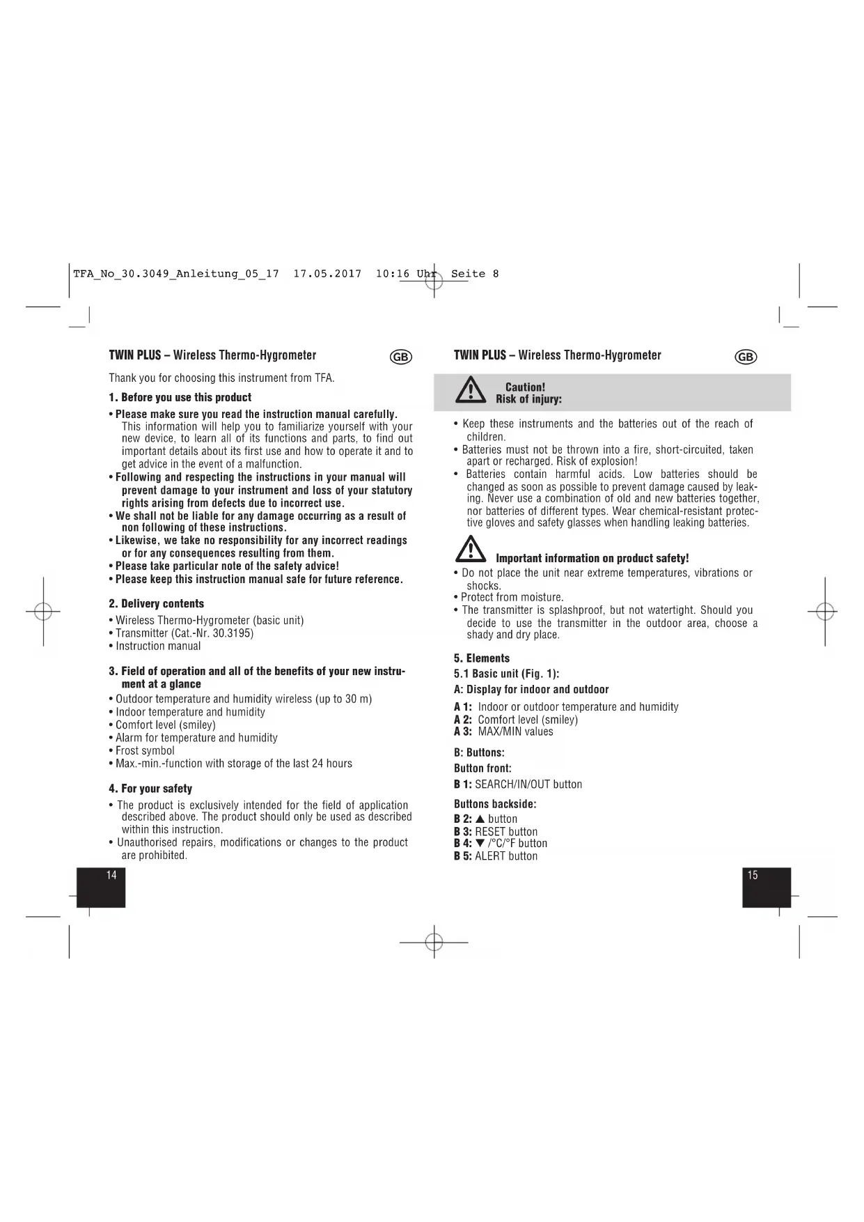 This product has been manufactured using high-grade materials and components which can be recycled and reused. Never dispose empty batteries and rechargeable bat- teries in household waste. As a consumer, you are legally required to take them to your retail store or to appropriate collection sites depending on national or local regulations in order to protect the environment. The symbols for the heavy metals contained are: Cd=cadmium, Hg=mercury, Pb=lead TFA_No_30.3049_Anleitung_05_17 17.05.2017 10:16 Uhr Seite 112322 TWIN PLUS – Wireless Thermo-Hygrometer