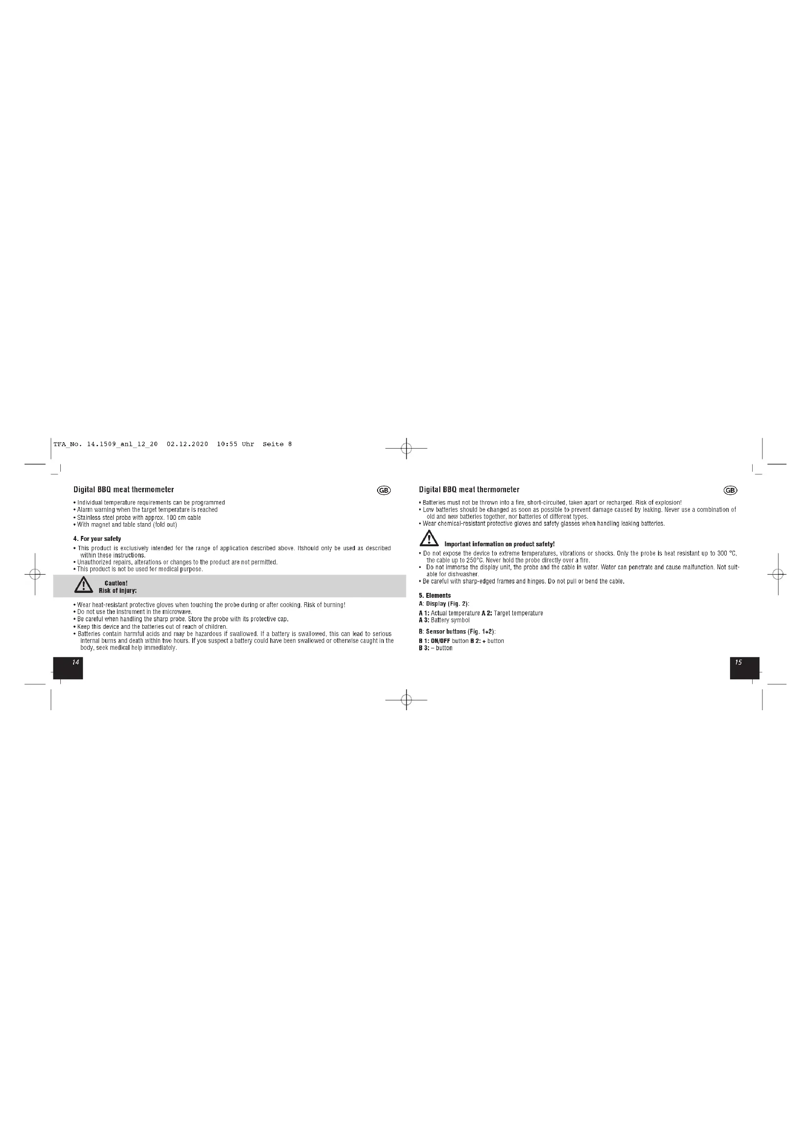 Download the instructions for your Thermometer in PDF format for free! Find your manual 14.1509.01 - TFA and take your electronic device back in hand. On this page are published all the documents necessary for the use of your device. 14.1509.01 by TFA.