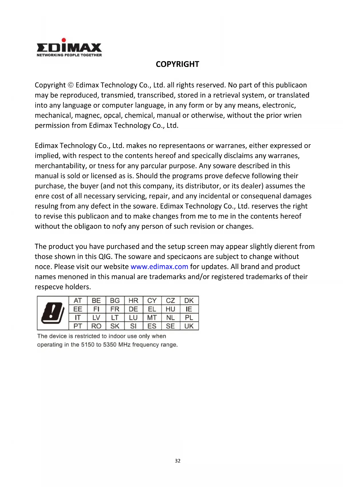 The product you have purchased and the setup screen may appear slightly dierent from those shown in this QIG. The soware and specicaons are subject to change without notice. Please visit our website www.edimax.com for updates. All brand and product names menoned in this manual are trademarks and/or registered trademarks of their respective holders.