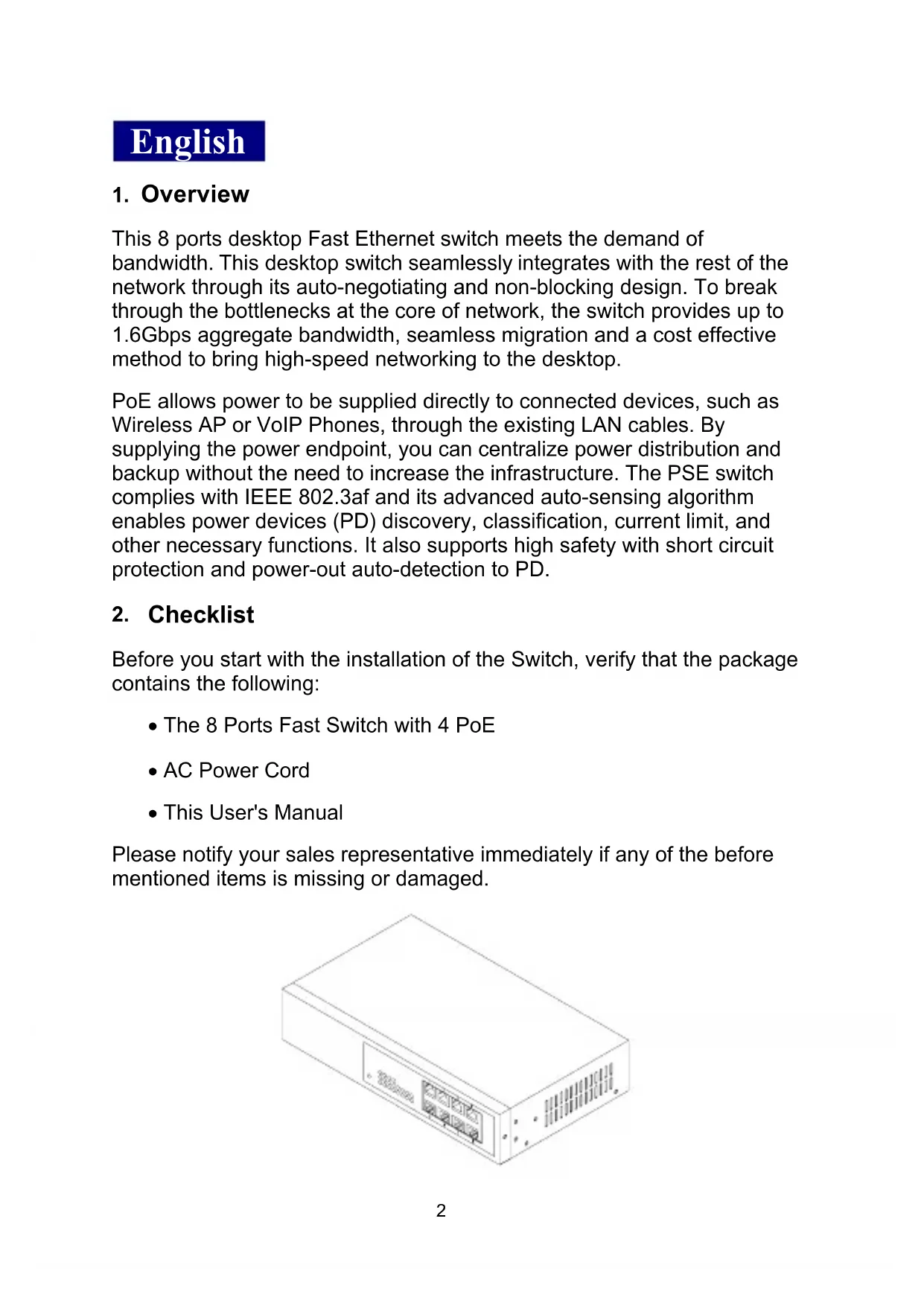 Checklist Before you start with the installation of the Switch, verify that the package contains the following: