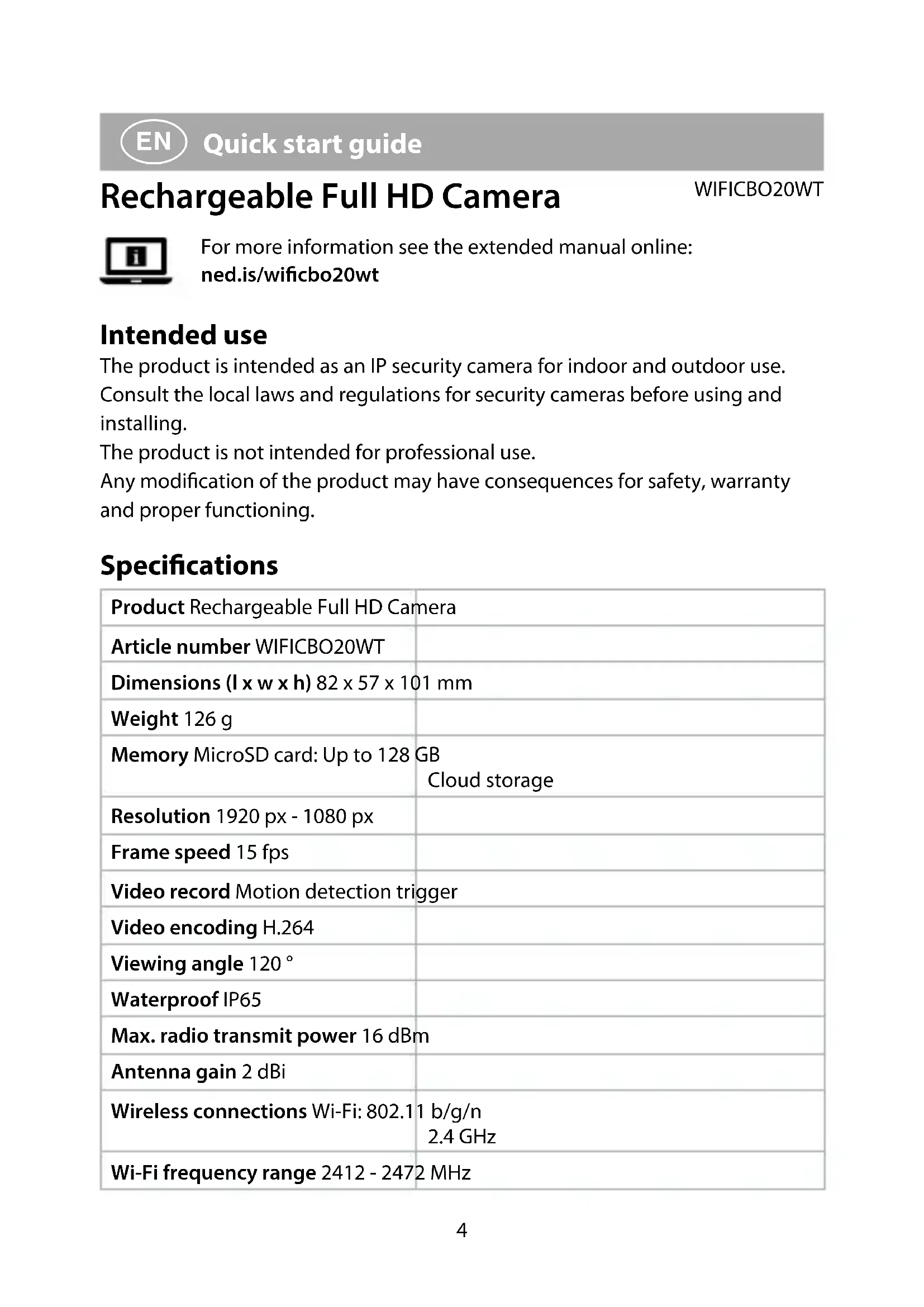 Quick start guide Rechargeable Full HD Camera WIFICBO20WT For more information see the extended manual online: ned.is/wicbo20wt Intended use The product is intended as an IP security camera for indoor and outdoor use. Consult the local laws and regulations for security cameras before using and installing. The product is not intended for professional use. Any modication of the product may have consequences for safety, warranty and proper functioning. Specications Product Rechargeable Full HD Camera Article number WIFICBO20WT Dimensions (l x w x h) 82 x 57 x 101 mm Weight 126 g Memory MicroSD card: Up to 128 GB Cloud storage Resolution 1920 px - 1080 px Frame speed 15 fps Video record Motion detection trigger Video encoding H.264 Viewing angle 120 ° Waterproof IP65 Max. radio transmit power 16 dBm Antenna gain 2 dBi Wireless connections Wi-Fi: 802.11 b/g/n