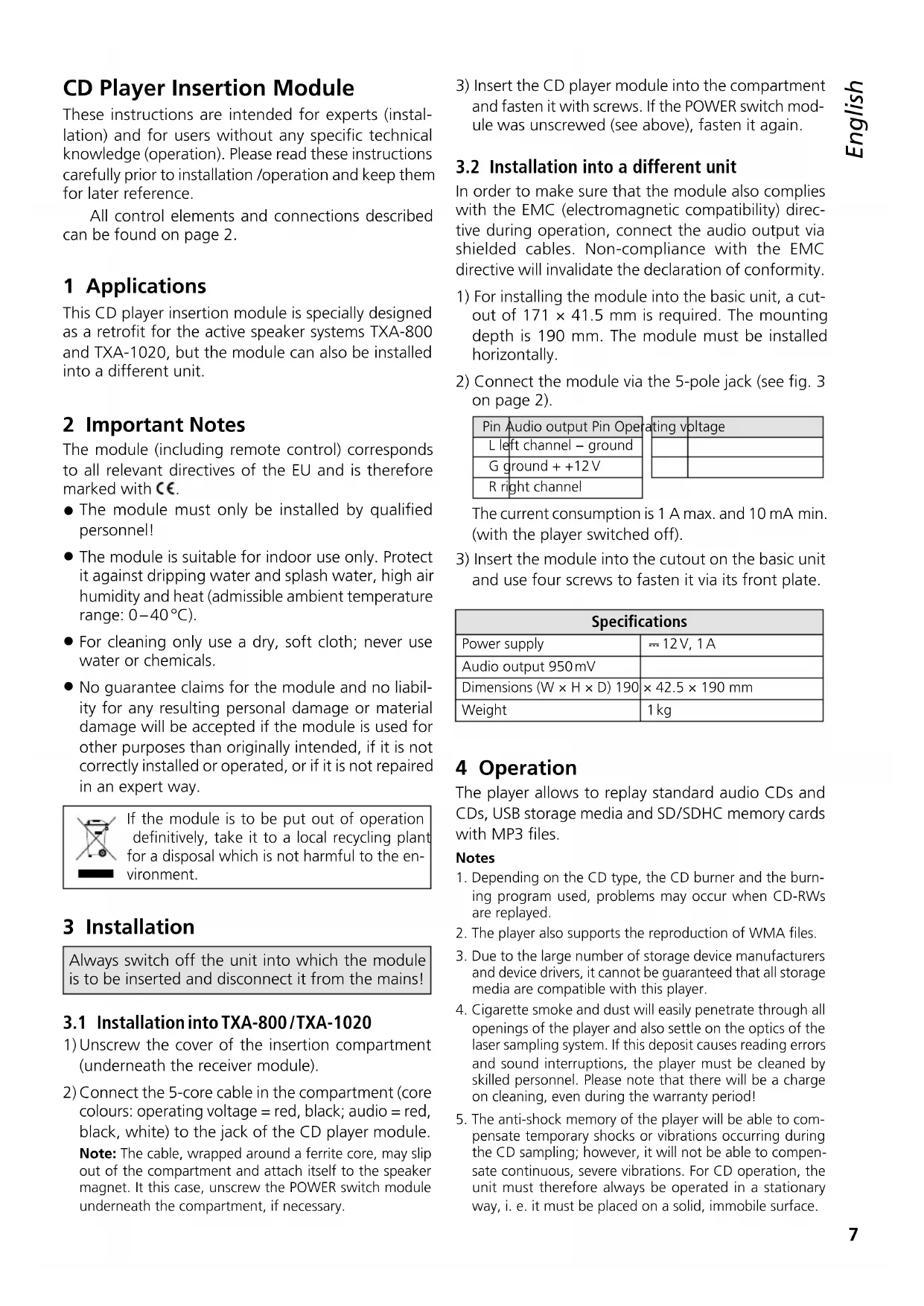 and use four screws to fasten it via its front plate. Specifications Power supply 12 V, 1 AAudio output 950 mVDimensions (W × H × D) 190 × 42.5 × 190 mmWeight 1 kg 4 Operation The player allows to replay standard audio CDs and CDs, USB storage media and SD / SDHC memory cards with MP3 files. Notes1. Depending on the CD type, the CD burner and the burn-ing program used, problems may occur when CD-RWs are replayed.2. The player also supports the reproduction of WMA files.3. Due to the large number of storage device manufacturers and device drivers, it cannot be guaranteed that all storage media are compatible with this player.4. Cigarette smoke and dust will easily penetrate through all openings of the player and also settle on the optics of the laser sampling system. If this deposit causes reading errors and sound interruptions, the player must be cleaned by skilled personnel. Please note that there will be a charge on cleaning, even during the warranty period!5. The anti-shock memory of the player will be able to com-pensate temporary shocks or vibrations occurring during the CD sampling; however, it will not be able to compen-sate continuous, severe vibrations. For CD operation, the unit must therefore always be operated in a stationary way, i. e. it must be placed on a solid, immobile surface. CD Player Insertion Module These instructions are intended for experts (instal- lation) and for users without any specific technical knowledge (operation). Please read these instructions carefully prior to installation /operation and keep them for later reference. All control elements and connections described can be found on page 2. 1 Applications This CD player insertion module is specially designed as a retrofit for the active speaker systems TXA-800 and TXA-1020, but the module can also be installed into a different unit. 2 Important Notes The module (including remote control) corresponds to all relevant directives of the EU and is therefore marked with .