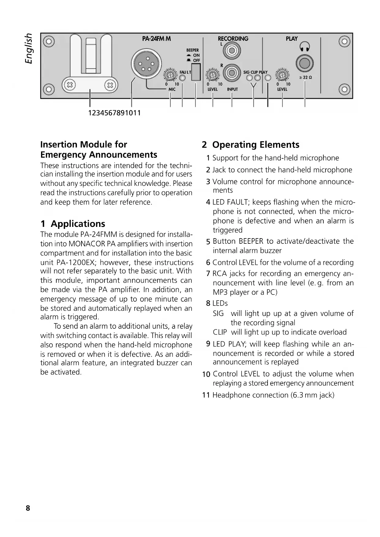 Insertion Module for EmergencyAnnouncements These instructions are intended for the techni- cian installing the insertion module and for users without any specific technical knowledge. Please read the instructions carefully prior to operation and keep them for later reference. 1 Applications The module PA-24FMM is designed for installa- tion into MONACOR PA amplifiers with insertion compartment and for installation into the basic unit PA-1200EX; however, these instructions will not refer separately to the basic unit. With this module, important announcements can be made via the PA amplifier. In addition, an emergency message of up to one minute can be stored and automatically replayed when an alarm is triggered. To send an alarm to additional units, a relay with switching contact is available. This relay will also respond when the hand-held microphone is removed or when it is defective. As an addi- tional alarm feature, an integrated buzzer can be activated. 2 Operating Elements 1 Support for the hand-held microphone 2 Jack to connect the hand-held microphone 3 Volume control for microphone announce- ments 4 LED FAULT; keeps flashing when the micro- phone is not connected, when the micro- phone is defective and when an alarm is triggered