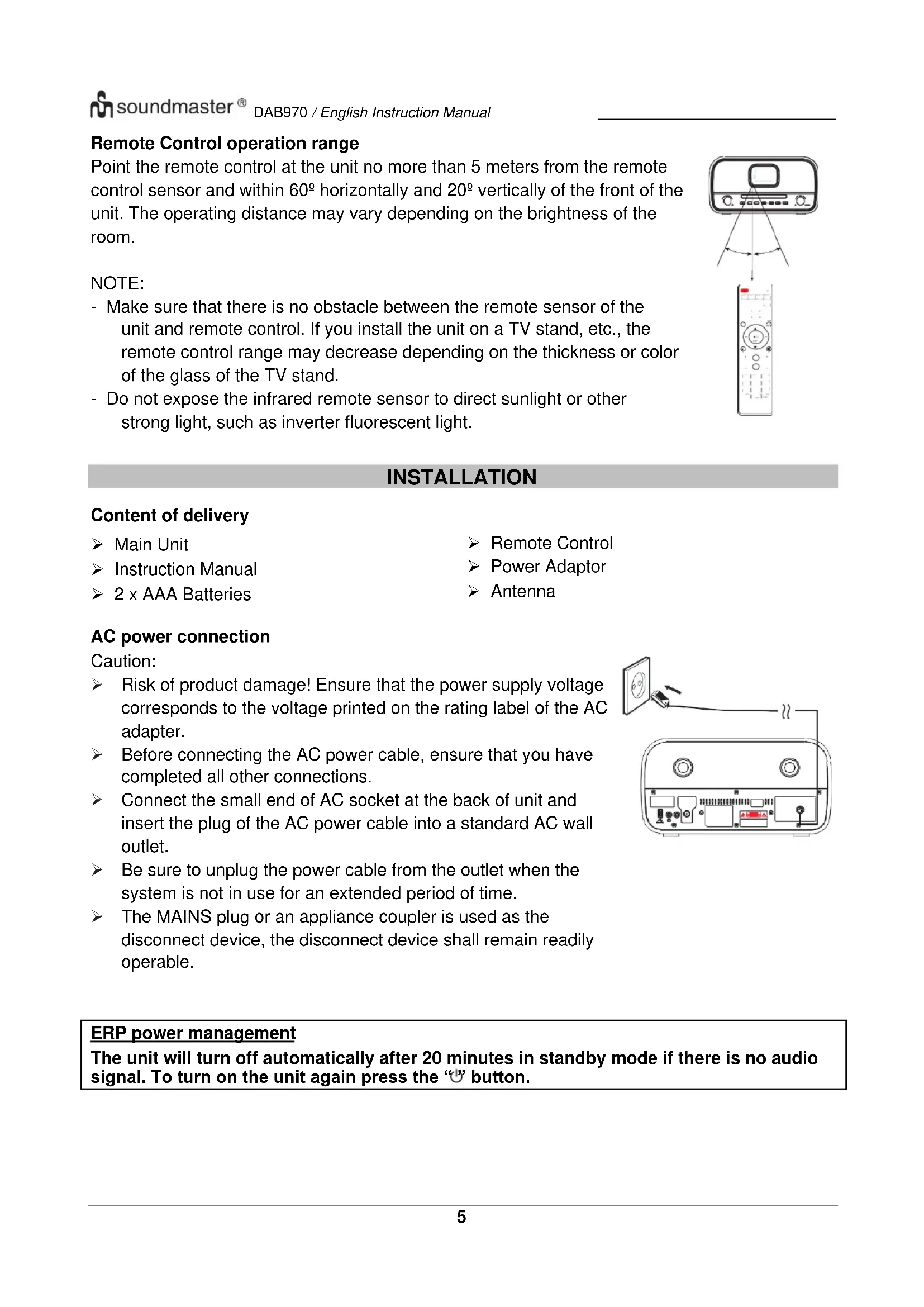 INSTALLATION Content of delivery ➢ Main Unit ➢ Remote Control ➢ Instruction Manual ➢ Power Adaptor ➢ 2 x AAA Batteries ➢ Antenna
