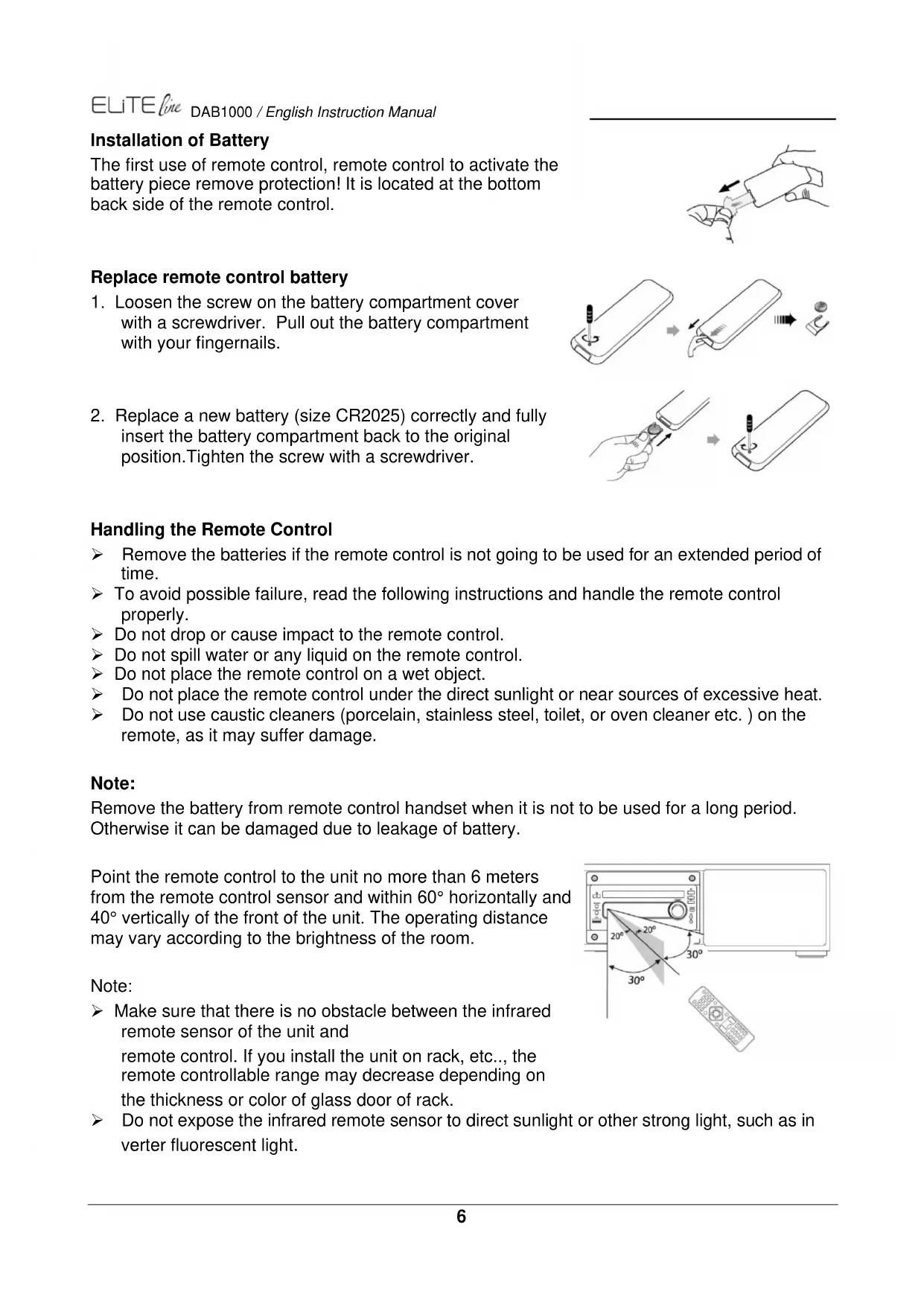 Handling the Remote Control ➢ Remove the batteries if the remote control is not going to be used for an extended period of time. ➢ To avoid possible failure, read the following instructions and handle the remote control properly. ➢ Do not drop or cause impact to the remote control. ➢ Do not spill water or any liquid on the remote control. ➢ Do not place the remote control on a wet object. ➢ Do not place the remote control under the direct sunlight or near sources of excessive heat. ➢ Do not use caustic cleaners (porcelain, stainless steel, toilet, or oven cleaner etc. ) on the remote, as it may suffer damage. Note: Remove the battery from remote control handset when it is not to be used for a long period. Otherwise it can be damaged due to leakage of battery. Point the remote control to the unit no more than 6 meters from the remote control sensor and within 60° horizontally and 40° vertically of the front of the unit. The operating distance may vary according to the brightness of the room. Note: ➢ Make sure that there is no obstacle between the infrared remote sensor of the unit and remote control. If you install the unit on rack, etc.., the remote controllable range may decrease depending on the thickness or color of glass door of rack. ➢ Do not expose the infrared remote sensor to direct sunlight or other strong light, such as in verter fluorescent light.DAB1000 / English Instruction Manual