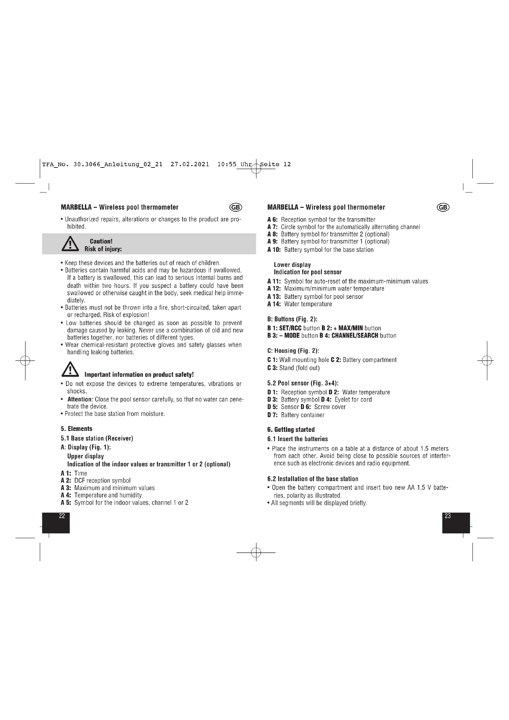 - This product is exclusively intended for the range of application described above. It should only be used as described within these instructions. TFA_No. 30.3066_Anleitung_02_21 27.02.2021 10:55 Uhr Seite 112322 MARBELLA – Wireless pool thermometer