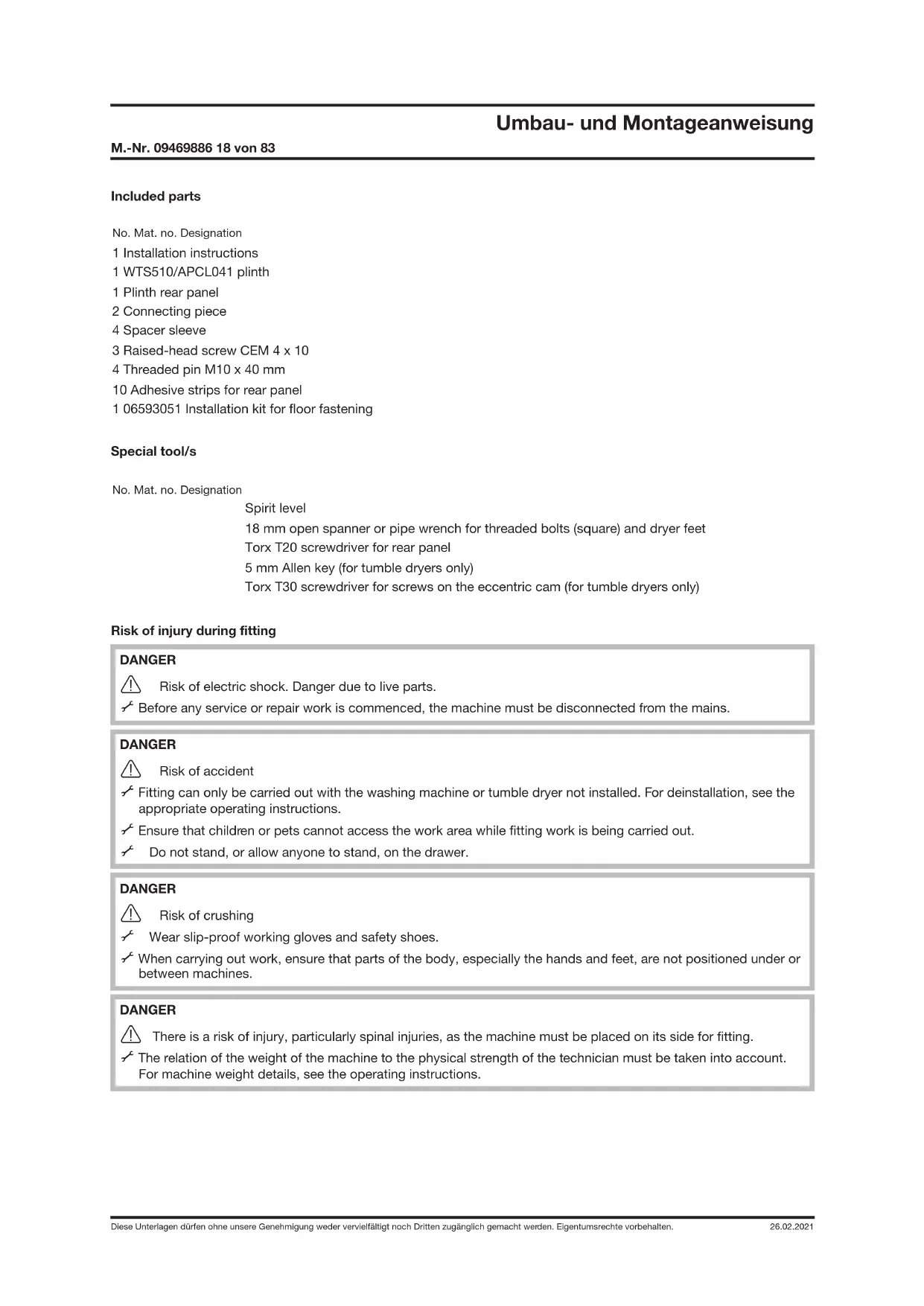 WTS510/APCL041 plinth with drawer for washing machines and tumble dryers Parts required No. Mat. no. Designation 1 09322300 WTS510 installation kit 1 11477320 APCL041 installation kitUmbau- und Montageanweisung M.-Nr. 09469886 18 von 83 Diese Unterlagen dürfen ohne unsere Genehmigung weder vervielfältigt noch Dritten zugänglich gemacht werden. Eigentumsrechte vorbehalten. 26.02.2021 Included parts No. Mat. no. Designation 1 Installation instructions 1 WTS510/APCL041 plinth 1 Plinth rear panel 2 Connecting piece 4 Spacer sleeve 3 Raised-head screw CEM 4x10 4 Threaded pin M10x40mm 10 Adhesive strips for rear panel 1 06593051 Installation kit for floor fastening Special tool/s No. Mat. no. Designation Spirit level 18mm open spanner or pipe wrench for threaded bolts (square) and dryer feet Torx T20 screwdriver for rear panel 5mm Allen key (for tumble dryers only) Torx T30 screwdriver for screws on the eccentric cam (for tumble dryers only) Risk of injury during fitting DANGER Risk of electric shock. Danger due to live parts. A Before any service or repair work is commenced, the machine must be disconnected from the mains. DANGER Risk of accident A Fitting can only be carried out with the washing machine or tumble dryer not installed. For deinstallation, see the appropriate operating instructions. A Ensure that children or pets cannot access the work area while fitting work is being carried out. A Do not stand, or allow anyone to stand, on the drawer. DANGER Risk of crushing A Wear slip-proof working gloves and safety shoes. A When carrying out work, ensure that parts of the body, especially the hands and feet, are not positioned under or between machines. DANGER There is a risk of injury, particularly spinal injuries, as the machine must be placed on its side for fitting. A The relation of the weight of the machine to the physical strength of the technician must be taken into account. For machine weight details, see the operating instructions.Umbau- und Montageanweisung M.-Nr. 09469886 19 von 83 Diese Unterlagen dürfen ohne unsere Genehmigung weder vervielfältigt noch Dritten zugänglich gemacht werden. Eigentumsrechte vorbehalten. 26.02.2021 Risk of injury due to incorrect fitting WARNING Risk of accident if machine tips over. A The plinth may only be used with Miele machines. A The plinth must not be used with integrated models or a washer-dryer stack combination. A Fasten the washing machine to the plinth. A With a combination with one or more other plinths, individual plinths must be connected together with the connection pieces. A With a single machine installation, secure the plinth to the floor with the floor fastening fitting kit, Mat. no. 06593051. A At least two plinth feet must be bolted to the floor and at least one of these should be at the rear. Fastening of two diagonally opposite feet is ideal. Danger due to unsuitable materials in the plinth drawer DANGER A Do not store any inflammable items in the drawer. NOTE Wooden parts may swell and/or warp. A Do not store any damp or wet items in the drawer. Plinth fitting Removal of drawer from plinth A Pull out the drawer fully, see Fig. 2. A Press the spring catches and at the same time lift the drawer upwards, see Fig. 3. Fitting the plinth under a tumble dryer A Empty the condensate container drawer. A Screw the dryer feet in fully with a pipe wrench. A Remove the threaded pins from the plinth with a 5mm Allen key (A) and dispose of them, see Fig. 4. A Fit the 10x40mm threaded pins supplied as far as possible into the threaded bolts (B), see Fig. 4. WARNING Risk of crushing fingers if they are trapped between the dryer casing and the threaded pins. A Do not lift the dryer at the corners. A Lift the dryer onto the plinth and guide the threaded pins into the openings in the dryer feet, see Fig. 5. A Fit the sealing strips as shown on the inside of the rear panel, see Fig. 6. A Loosen the screws on the eccentric cam (1) on the dryer rear panel, see Fig. 7 The eccentric cams may move slightly when the screws are loosened. To ensure safe installation, the eccentric cams must be returned to the starting position: Engaging tooth in the bottom left at a 20° angle (1), see Fig. 7. A Use 1 CEM 4x10 raised-head screw to fit the rear panel on the plinth at the bottom (2), see Fig. 7. A Hook the connection pieces (3) onto the screws on the eccentric cams, see Fig. 7. A Use 2 CEM 4x10 raised-head screws to fit the connection pieces and the rear panel on the plinth at the top (1), see Fig. 8.Umbau- und Montageanweisung M.-Nr. 09469886 20 von 83 Diese Unterlagen dürfen ohne unsere Genehmigung weder vervielfältigt noch Dritten zugänglich gemacht werden. Eigentumsrechte vorbehalten. 26.02.2021 A Tighten the screws on the eccentric cams (2), see Fig. 8. A Level the machine and plinth using a spirit level. A Counter the plinth feet. A Secure the plinth to the floor with the floor fastening fitting kit, Mat. no. 06593051. Installing the plinth under the washing machine Before the actual assembly, the connection pieces are secured on the plinth. They are used to connect two plinths securely together. Tighten the connection pieces even if a second plinth is not to be used. This will avoid possibly difficult retro fitting and also ensures that the connection pieces are stored safely. Installation of dryer on left and washing machine on right: See Fig. 9. Installation of washing machine on left and dryer on right: See Fig. 10. A Use a pipe wrench to hold the threaded bolts in the plinth and remove the plinth feet. A Unscrew 2 plinth feet from the left or right side, depending on the installation setup; see Fig. 9 or Fig. 10. A Fit the washers on the drip tray, see Fig. 9 or Fig. 10. A Install the connection pieces (1) on the washers; see Fig. 9 or Fig. 10. A Screw on the 2 plinth feet but don't secure them with the counter nuts yet. NOTE Damage to washing machine and flooring. A Drain all water out of the washing machine. A Remove the dispenser u