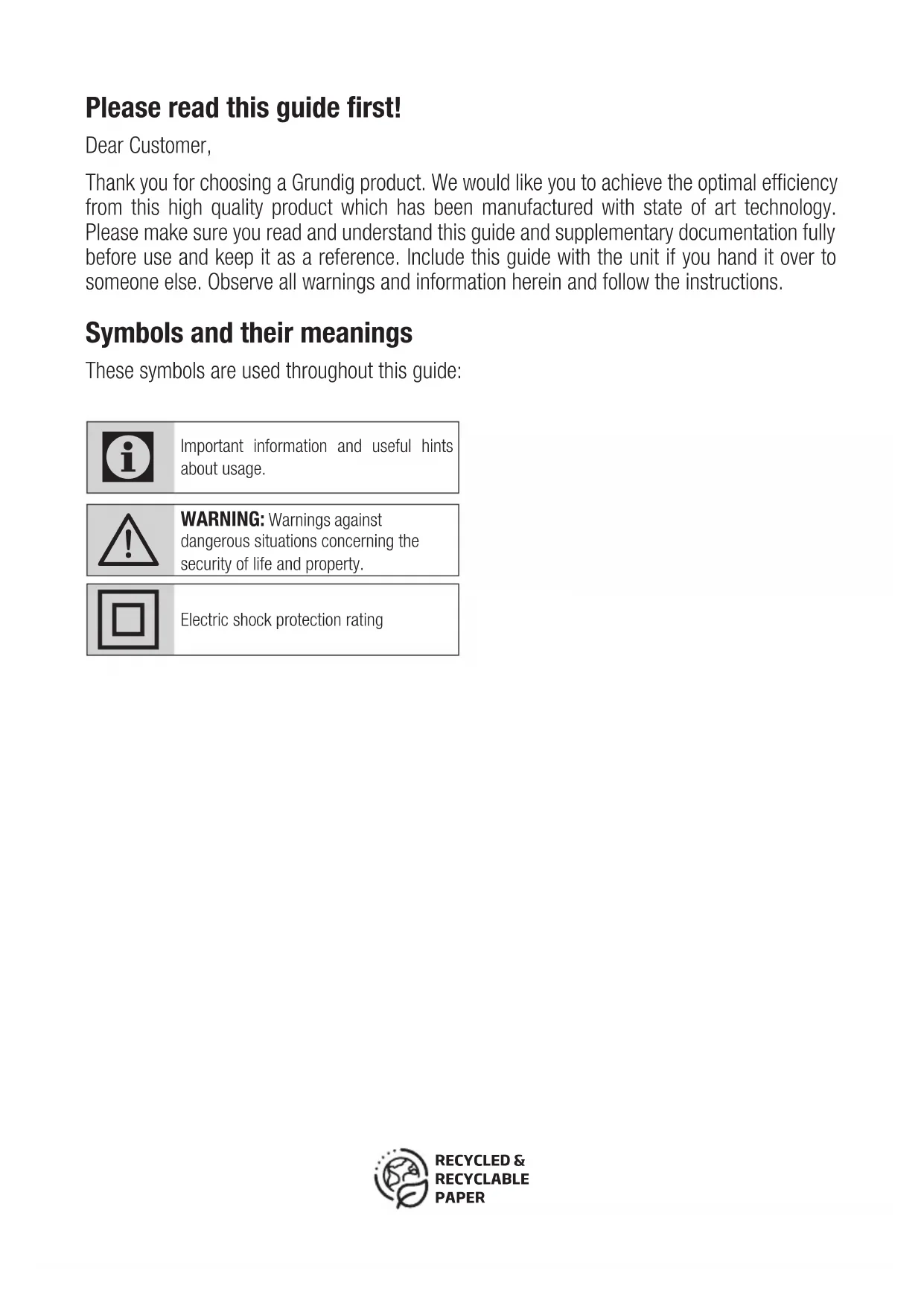 Diese Garantiezusage ist nur gültig innerhalb der Bundesrepublik Deutschland Garantiebedingungen - Grundig - 01/2021 01-21-02Please read this guide first! Dear Customer, Thank you for choosing a Grundig product. We would like you to achieve the optimal efficiency from this high quality product which has been manufactured with state of art technology. Please make sure you read and understand this guide and supplementary documentation fully before use and keep it as a reference. Include this guide with the unit if you hand it over to someone else. Observe all warnings and information herein and follow the instructions. Symbols and their meanings These symbols are used throughout this guide: