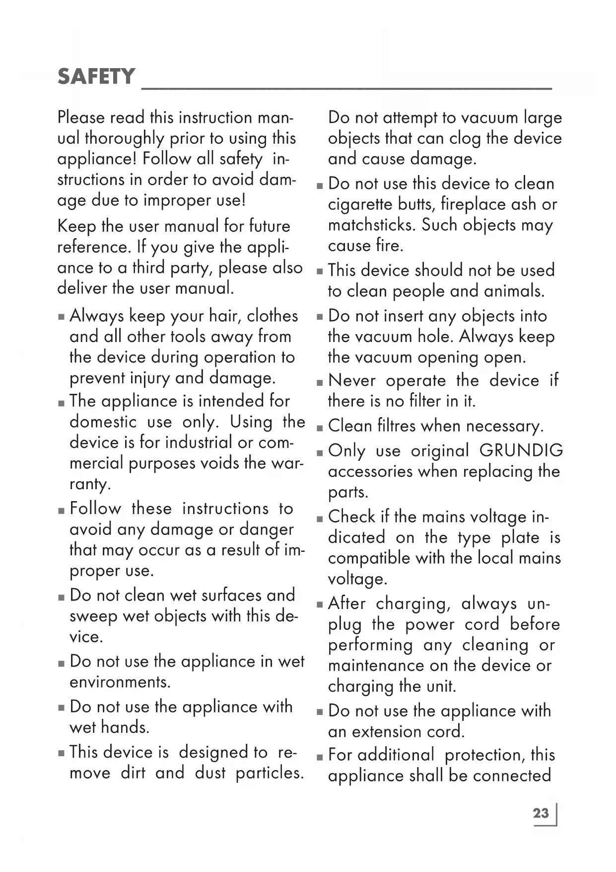GRUNDIG Household Appli- ances complies with applica- ble safety standards; therefore, when the appliance or power cord is damaged, it must be re- placed by the seller, the service centre or a service authority with similar expertise and authority to avoid any danger. Faulty or unqualified repair work may cause danger and risks to the user.
