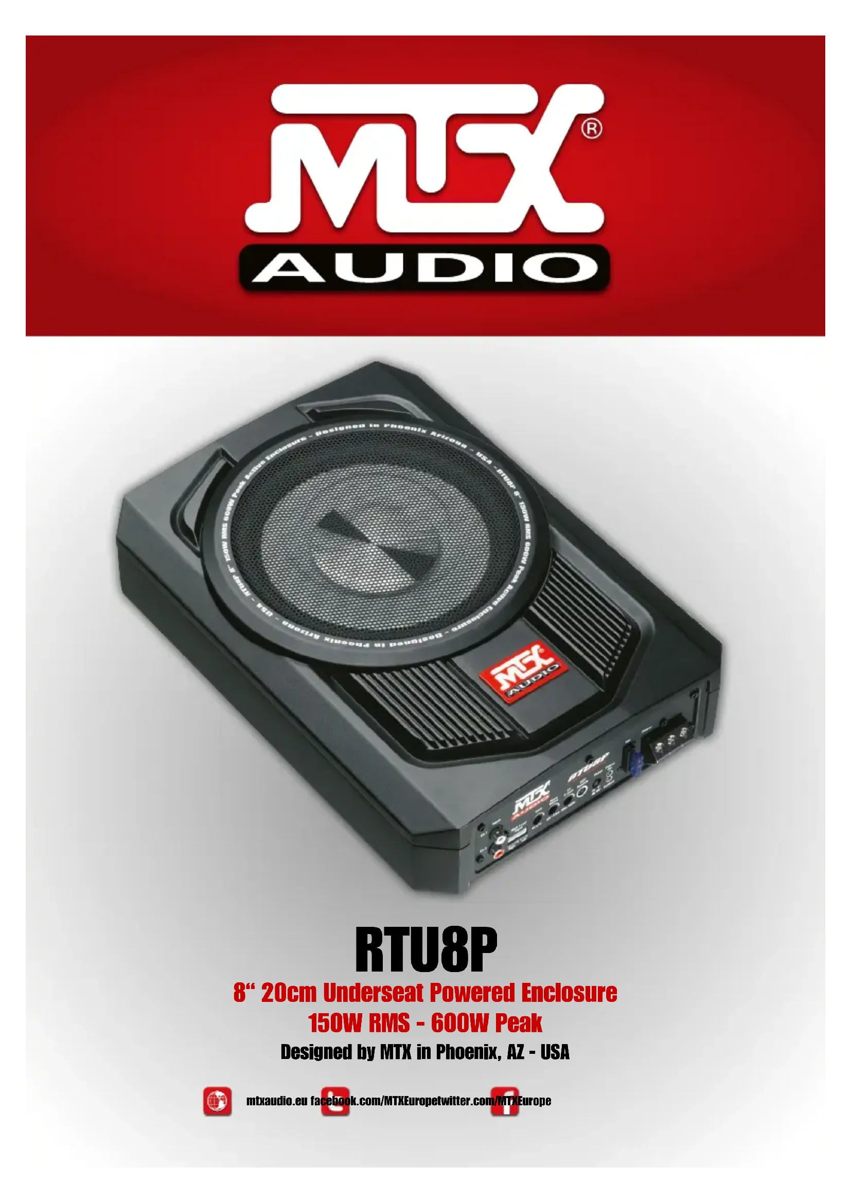 mtxaudio.eu facebook.com/MTXEuropetwitter.com/MTXEurope RTU8P 8“ 20cm Underseat Powered Enclosure 150W RMS - 600W Peak Designed by MTX in Phoenix, AZ - USAOwner’s Manual - MTX RTU8P Thank You !