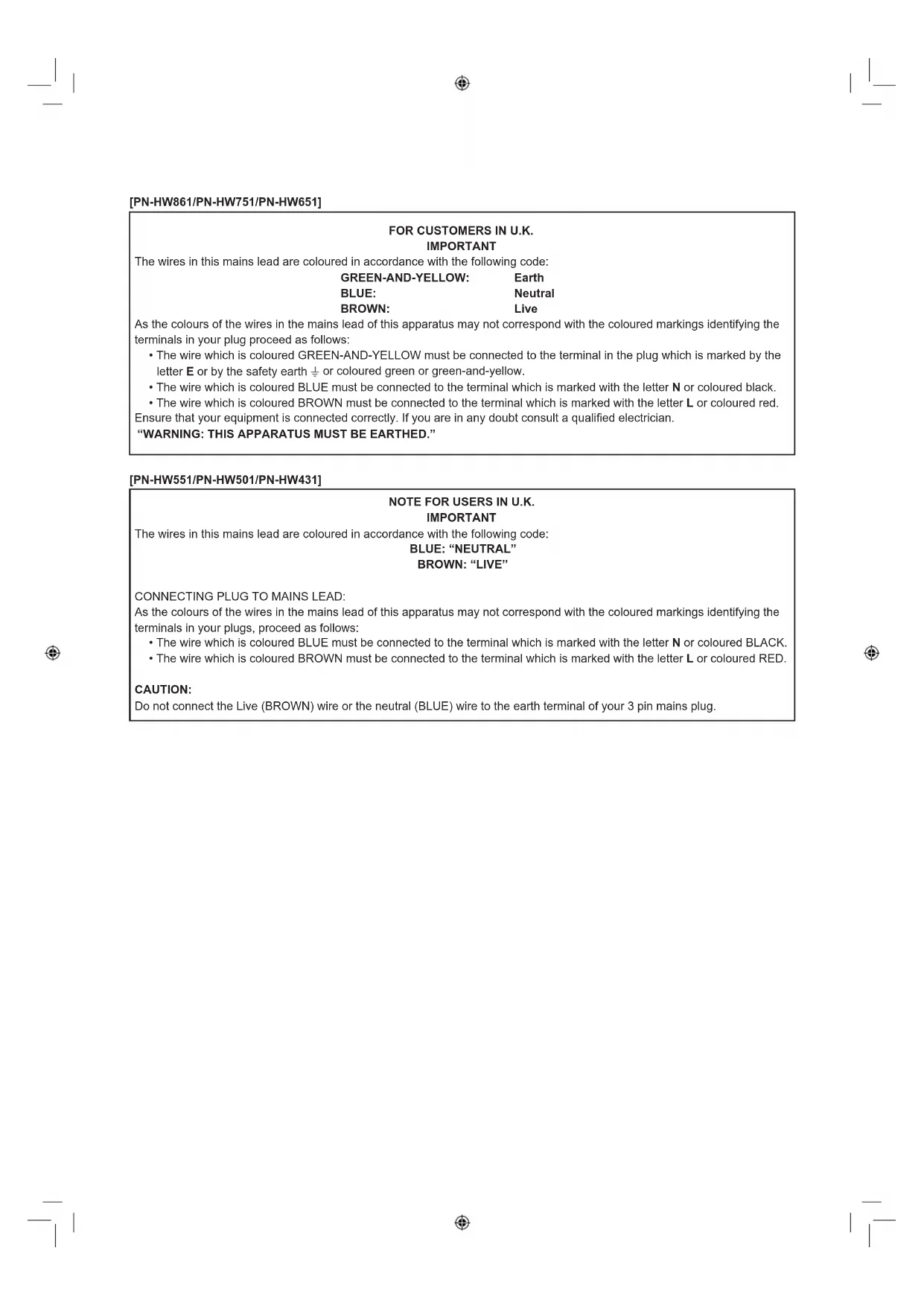 [PN-HW861/PN-HW751/PN-HW651] NOTE FOR USERS IN U.K. IMPORTANT The wires in this mains lead are coloured in accordance with the following code: BLUE: “NEUTRAL” BROWN: “LIVE” CONNECTING PLUG TO MAINS LEAD: As the colours of the wires in the mains lead of this apparatus may not correspond with the coloured markings identifying the terminals in your plugs, proceed as follows: