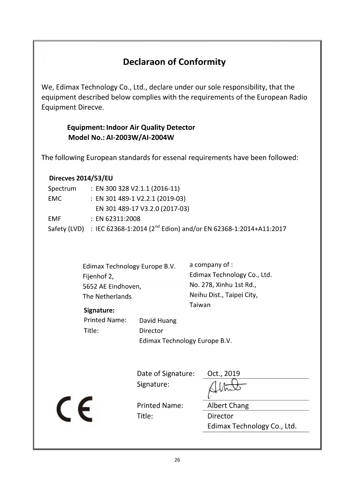 Declaration of Conformity We, Edimax Technology Co., Ltd., declare under our sole responsibility, that the equipment described below complies with the requirements of the European Radio Equipment Directive. Equipment: Indoor Air Quality Detector Model No.: AI-2003W/AI-2004W