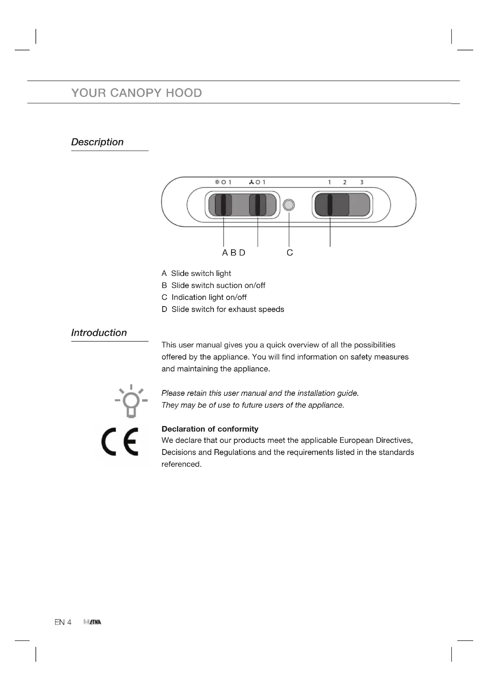 A B D A Slide switch light B Slide switch suction on/off C Indication light on/off D Slide switch for exhaust speeds Introduction This user manual gives you a quick overview of all the possibilities offered by the appliance. You will find information on safety measures and maintaining the appliance. Please retain this user manual and the installation guide. They may be of use to future users of the appliance. Declaration of conformity We declare that our products meet the applicable European Directives, Decisions and Regulations and the requirements listed in the standards referenced.