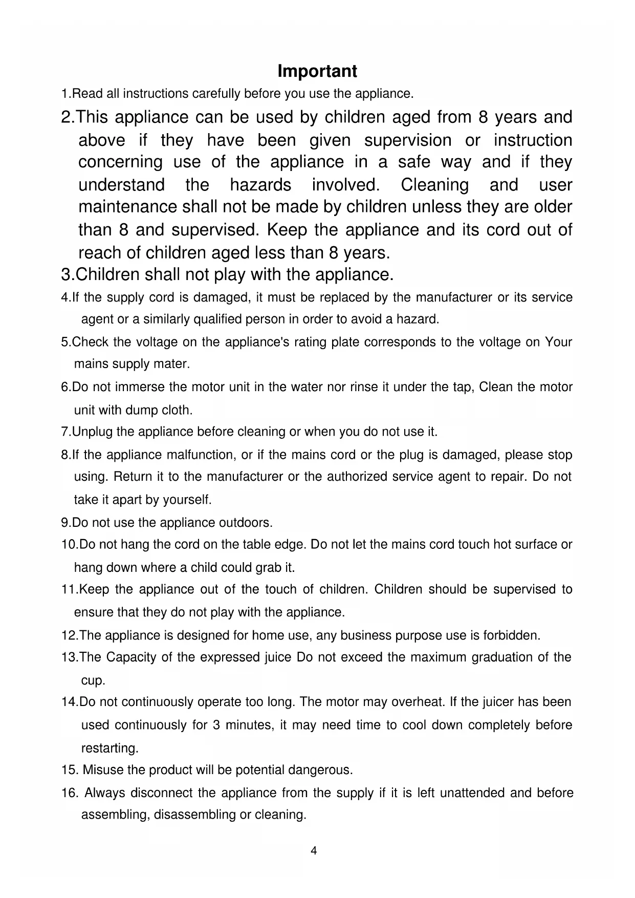 Eliminação Correcta deste Produto Esta marca indica que este produto não deve ser descartado junto com outros resíduos domésticos em toda a CE. Para evitar possíveis danos ao meio ambiente ou à saúde humana causados pela eliminação incontrolada de resíduos, recicle-o responsavelmente para promover a reutilização sustentável dos recursos materiais. Para retornar o aparelho utilizado, por favor use o sistema de recolha ou contacte o revendedor onde o produto foi comprado. Eles podem levar este produto para a reciclagem segura do ambiente. 3Important 1.Read all instructions carefully before you use the appliance. 2.This appliance can be used by children aged from 8 years and above if they have been given supervision or instruction concerning use of the appliance in a safe way and if they understand the hazards involved. Cleaning and user maintenance shall not be made by children unless they are older than 8 and supervised. Keep the appliance and its cord out of reach of children aged less than 8 years. 3.Children shall not play with the appliance. 4.If the supply cord is damaged, it must be replaced by the manufacturer or its service agent or a similarly qualified person in order to avoid a hazard. 5.Check the voltage on the appliance's rating plate corresponds to the voltage on Your mains supply mater. 6.Do not immerse the motor unit in the water nor rinse it under the tap, Clean the motor unit with dump cloth. 7.Unplug the appliance before cleaning or when you do not use it. 8.If the appliance malfunction, or if the mains cord or the plug is damaged, please stop using. Return it to the manufacturer or the authorized service agent to repair. Do not take it apart by yourself. 9.Do not use the appliance outdoors. 10.Do not hang the cord on the table edge. Do not let the mains cord touch hot surface or hang down where a child could grab it. 11.Keep the appliance out of the touch of children. Children should be supervised to ensure that they do not play with the appliance. 12.The appliance is designed for home use, any business purpose use is forbidden. 13.The Capacity of the expressed juice Do not exceed the maximum graduation of the cup. 14.Do not continuously operate too long. The motor may overheat. If the juicer has been used continuously for 3 minutes, it may need time to cool down completely before restarting.